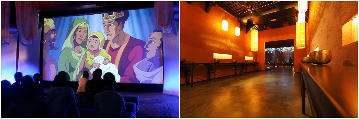 Walking with Buddha การนำเสนอเรื่องราวของชีวประวัติของพระพุทธเจ้าตั้งแต่ยังทรงเป็นเจ้าชายสิทธัตถะ และ เรื่องราวต่างๆจนได้กลายเป็นพระพุทธเจ้าที่มีประชาชมศรัทธาและเลื่อมใส ผ่านการ์ตูนแอนิเมชั่น จากนั้นเดินชม นิทรรศการ เกี่ยวกับศาสดาของศาสนาพุทธ อันน่าเลือมใส