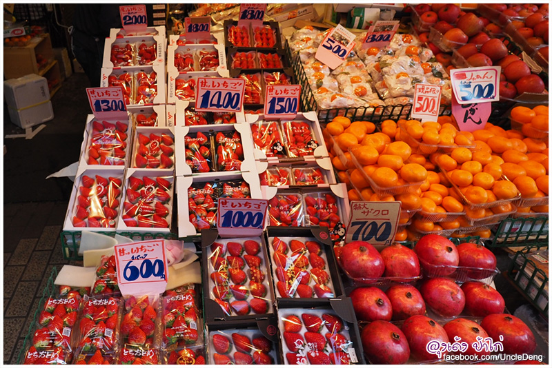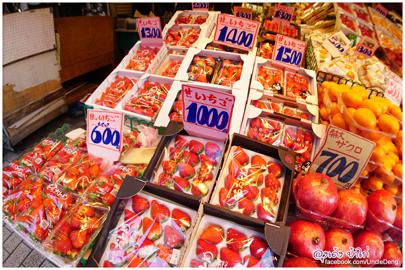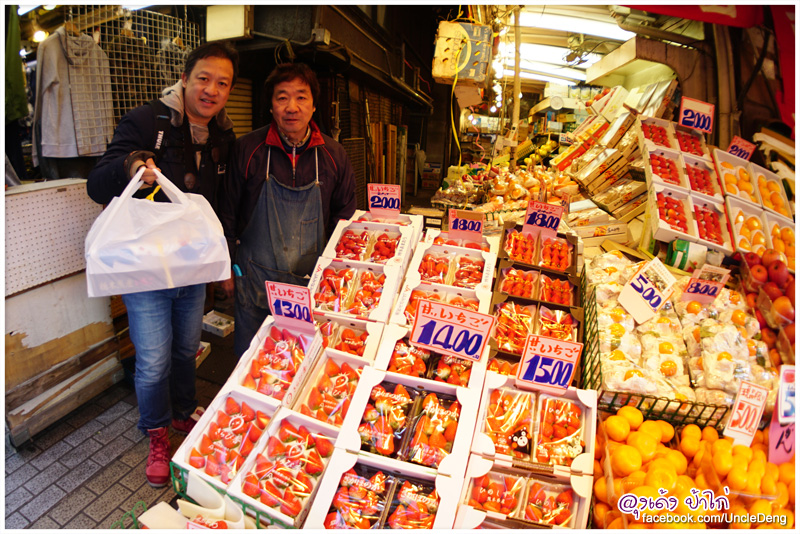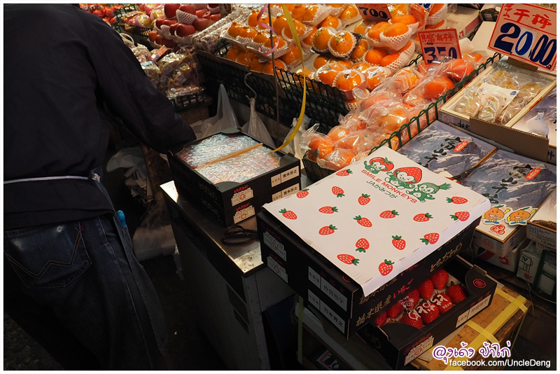 การมาเยือนตลาดอะเมโยโกะ ลุงเด้งป้าไก่ เลือกมาเดินวันสุดท้าย เพราะมีเป้าหมายคือมาซื้อสตรอเบอรี่ แบบยกลัง ขึ้นเครื่องกลับบ้านตอนเย็น ร้านผลไม้ในย่านนี้มีให้เลือก 4-5 ร้าน ราคาขึ้นอยู่กับคุณภาพของผลไม้ อย่างสตรอเบอรี่ ก็มีหลายพันธ์ หลายขนาด รสชาติก็แตกต่างกันไป มีให้เลือกตั้งแต่แพ็คละ 600 เยน - 1300 เยน (ประมาณ 180 - 400 บาท เท่านั้น)