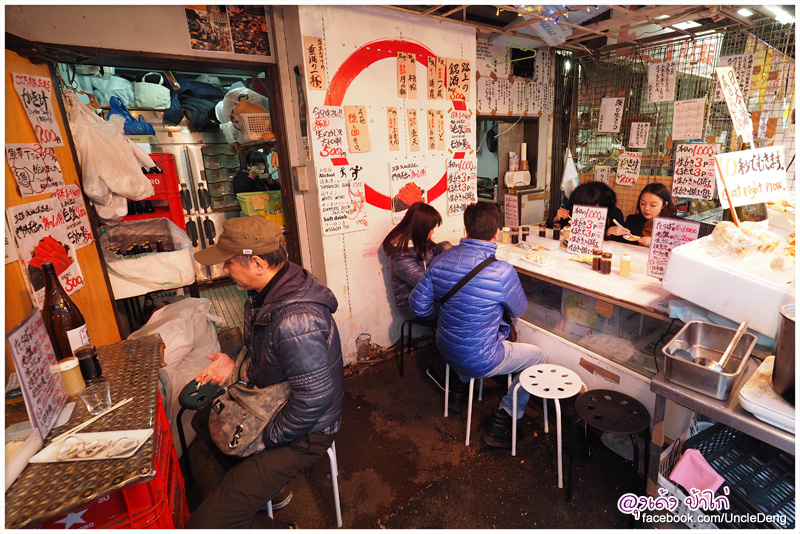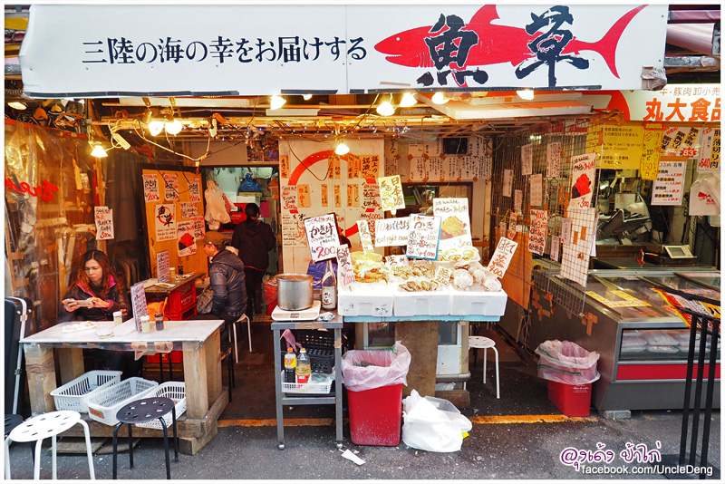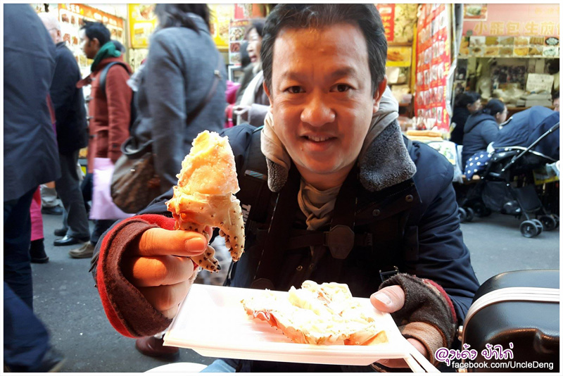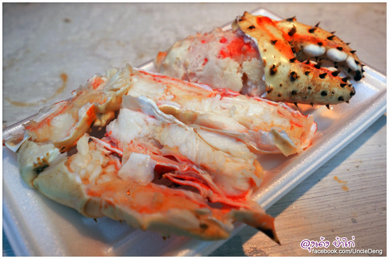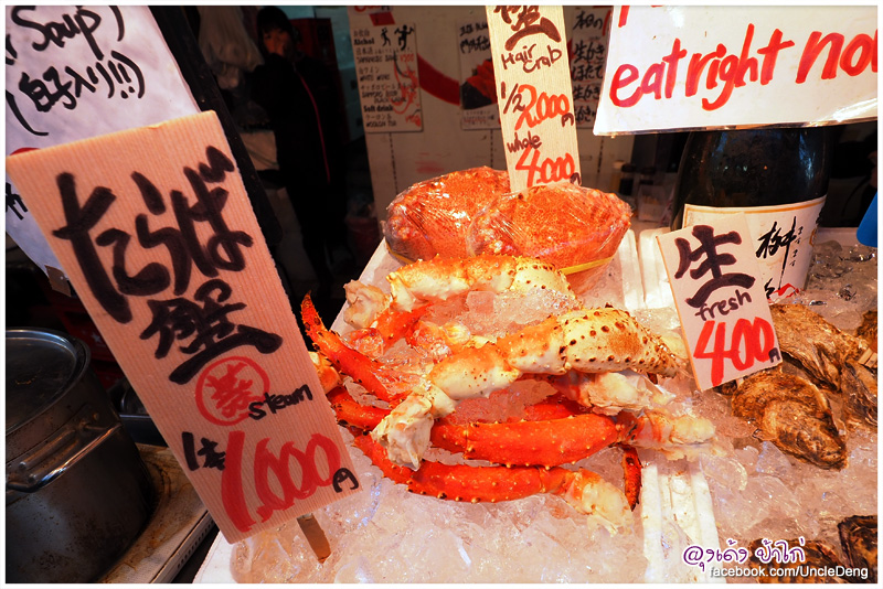 จากนั้นว่าจะเดินไปกินข้าวหน้าปลาดิบ แต่คนนั่งกันเต็มร้าน ก็เลยเดินไปร้านขายกินขาปู (King Crab) นึ่ง ขาละ 1,000 เยน (ประมาณ 300 บาท) ร้านเล็กๆ แห่งนี้นี้จะมีของสดให้เลือกหน้าร้าน จะเป็นหอย กับ ปู เป็นหลัก หลังร้านเป็นเตาต้มๆ นึ่งๆ ลูกค้านั่งกินหน้าร้านริมทางเดิน อารมณ์นั่งกินในตลาดริมทางนั่นแหละครับ