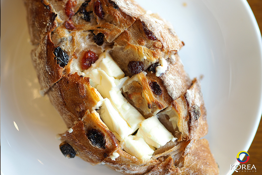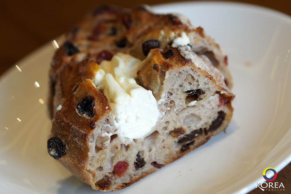 ขนมปังที่สั่งมา พนักงานจะนำไปอุ่นร้อนให้อีก 1 รอบ ขนมปังชิ้นนี้ เนื้อนอกกรอบ เนื้อในเหนียวนุ่ม และผลไม้แห้งก็ใส่มาแบบเต็มที่จริงๆ