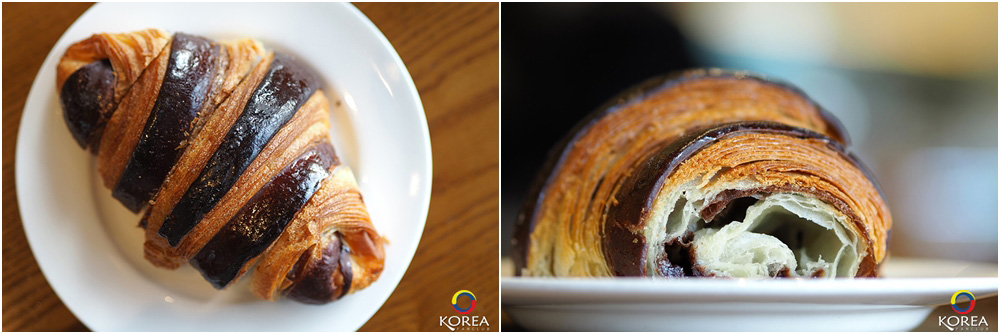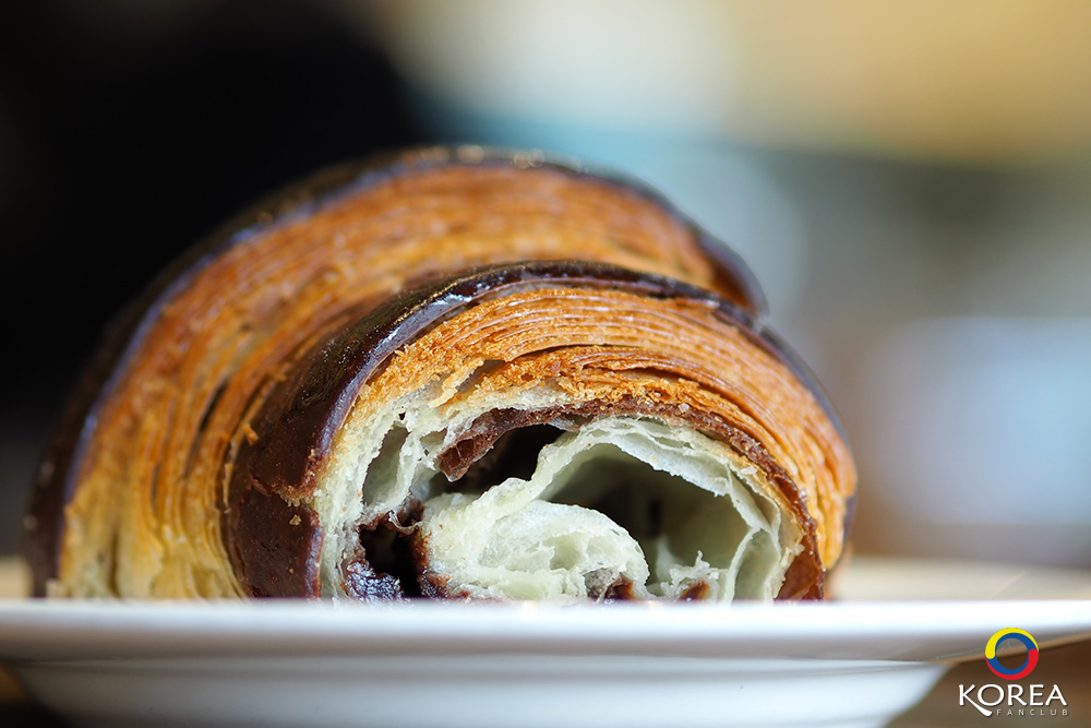 ครัวซอง ช็อคโกแลต นี่ชิ้นใหญ่ เส้นสาย คมมากๆ ผ่าดูด้านใน แป้งพายซ้อนกันหลายชั้นเหลือเกิน กรอบอร่อยมากๆ