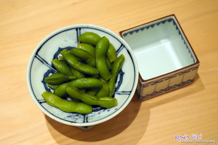 เริ่มมื้อนี้ด้วยเมนูกินเล่น แต่รสชาติไม่เล่นๆ นะครับ อร่อยจริงๆ จังๆ ถั่วแระญี่ปุ่นรสวาซาบิ (Marinated wasabi green soybeans) ราคา 120.- ใช้ถั่วแระนำเข้าจากญี่ปุ่น เวลาเคี้ยวสัมผัสได้ถึงความหอม และความเค็มของซุปปลา และรสเผ็ดเล็กๆ จากวาซาบิ