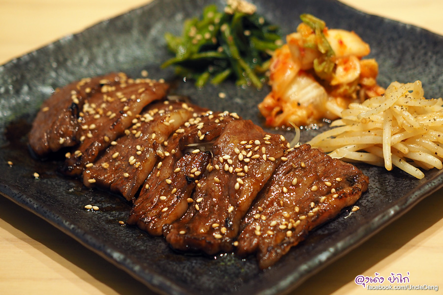 Karubi Yakiniku เนื้อซี่โครงย่าง หมักด้วยซอสสูตรพิเศษ ราคา 760.- ใช้เนื้อชั้นดีจากวัวพันธุ์ญี่ปุ่นขนดำ (Japanese Black หรือ Kuroge) จากเมือง Kagoshima ความอร่อยของเนื้อจานนี้บรรยายไม่ได้ต้องไปชิมกันเอง ลุงเด้ง ป้าไก่รับรองถูกปากคนไทยแน่นอน