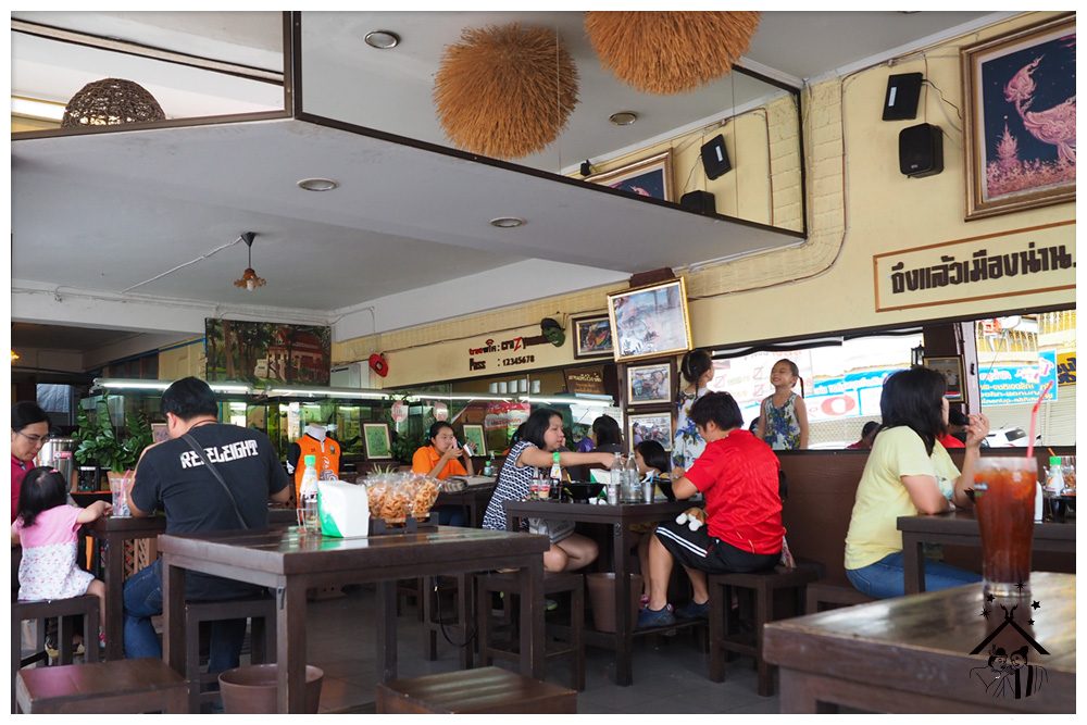โครงสร้างเป็นศาลาทำด้วยไม้ ด้านในสุดมีพื้นที่สำหรับนั่งกินแบบขันโตก รายการอาหารมีให้เลือกหลากหลาย ทั้งของพื้นเมือง รวมถึงเมนูภาคกลาง เมนูเด่นๆของที่นี่ ก็น่าจะเป็น ขนมจีน ชุดใหญ่ มาพร้อมผักเคืองเคียง และน้ำแกงขนมจีนครบชุด ไม่ว่าจะเป็นน้ำเงี้ยว น้ำกะทิ และน้ำพริก