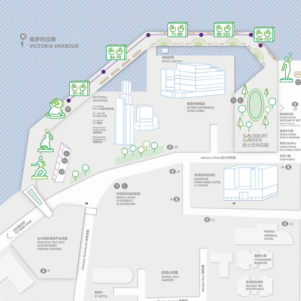 ภาพนี้คือตำแหน่ง การจัดแสดง รอยผ่ามือดารา และ ตำแหน่งของ รูปหล่อโลหะของ Bruce Lee, Anita Mui และ หมู MCDULL การ์ตูนสุดฮิตของฮ่องกง