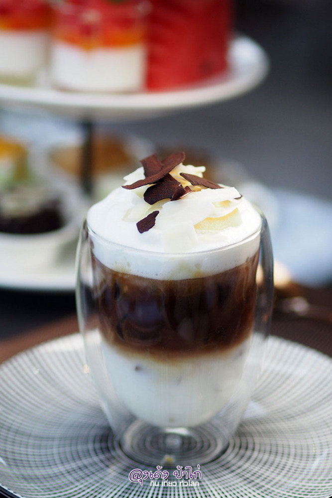 กาแฟเอสเพรสโซ่ ผสมผสานกับนมกะทิรมควัน โรยด้วยมะพร้าวอบกรอบ หอมหวานกำลังดี