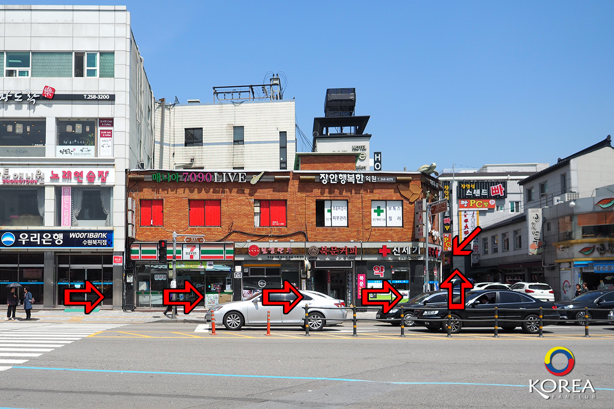 การเดินทาง : Suwon Station Exit 4 ขึ้นรถบัสหมายเลข 11 หรือ 13 หน้าโรงแรม Novotel Ambassador Suwon -> ผ่าน วงเวียน Paldalmun Gate -> ผ่านทางแยก