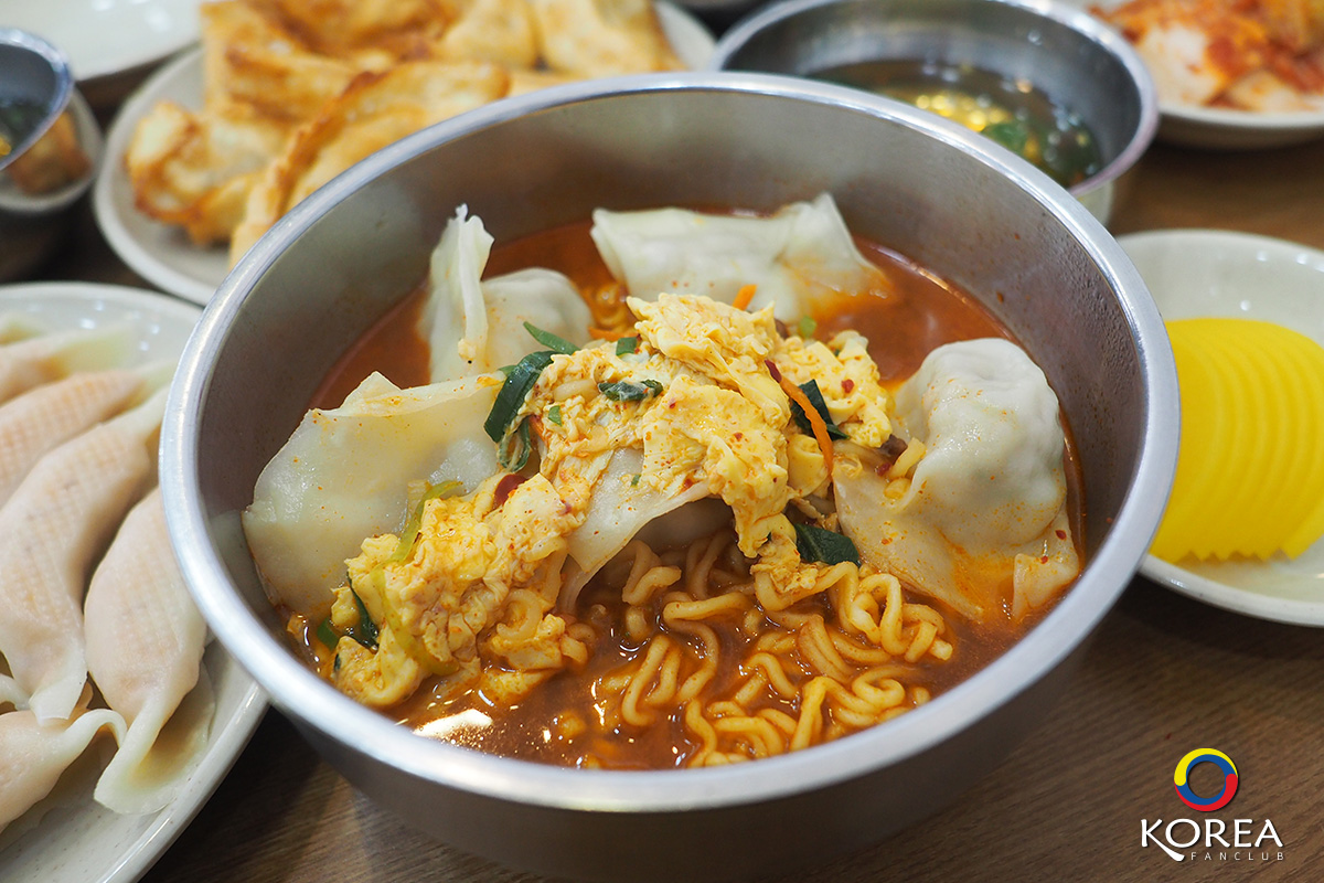 บะหมี่สำเร็จรูป รสเผ็ด + เกี๊ยว ชามนี้ 5,000 วอน ราคามาตรฐาน ราคานี้เกือบทุกร้าน