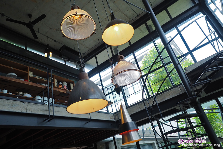 บรรยากาศภายในตกแต่งในสไตล์ลอฟต์ เพดานปูนเปลือยโชว์งานระบบ โครงสร้างเหล็กย้อมดำ โคมไฟแบบใช้ในโรงงานอุตสาหกรรม เพิ่มความเป็นลอฟต์ให้เด่นชัดมากยิ่งขึ้น