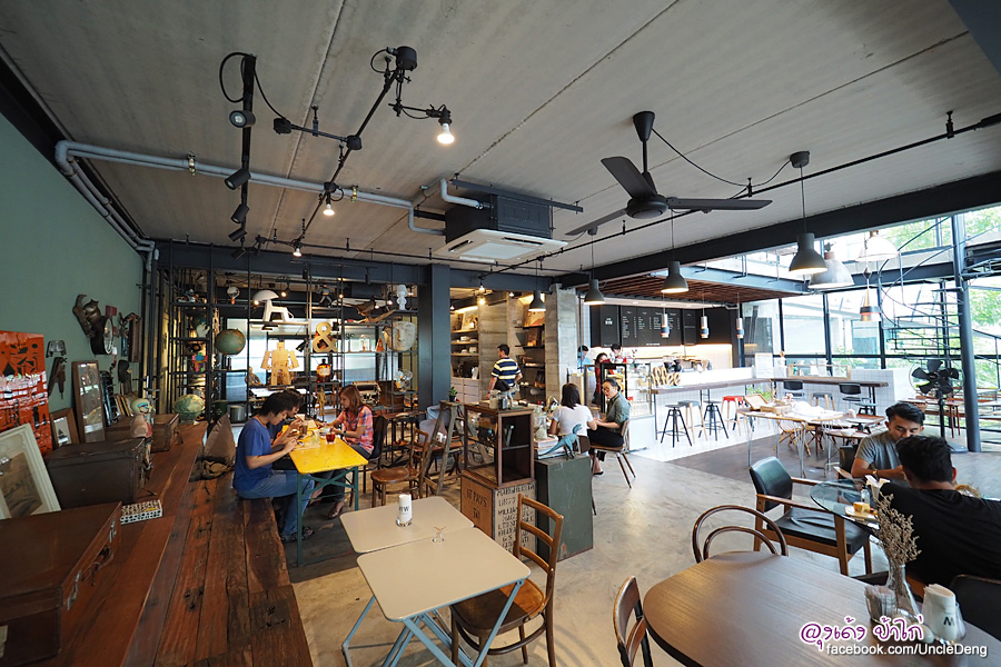 เพดานปูนเปลือยโชว์งานระบบ โต๊ะ และ เก้าอี้ หลายรูปแบบ หลากสไตล์ จัดว่างได้อย่างลงตัว