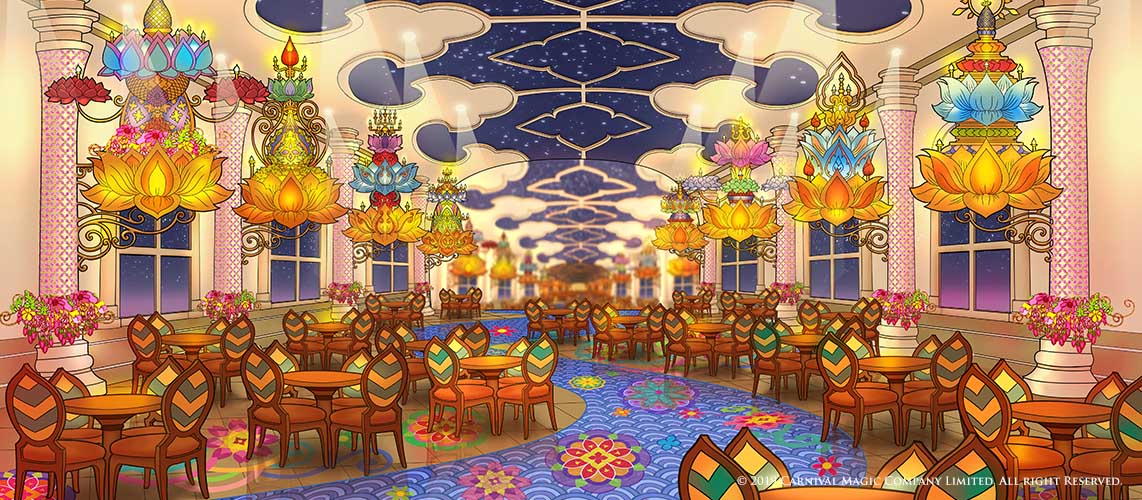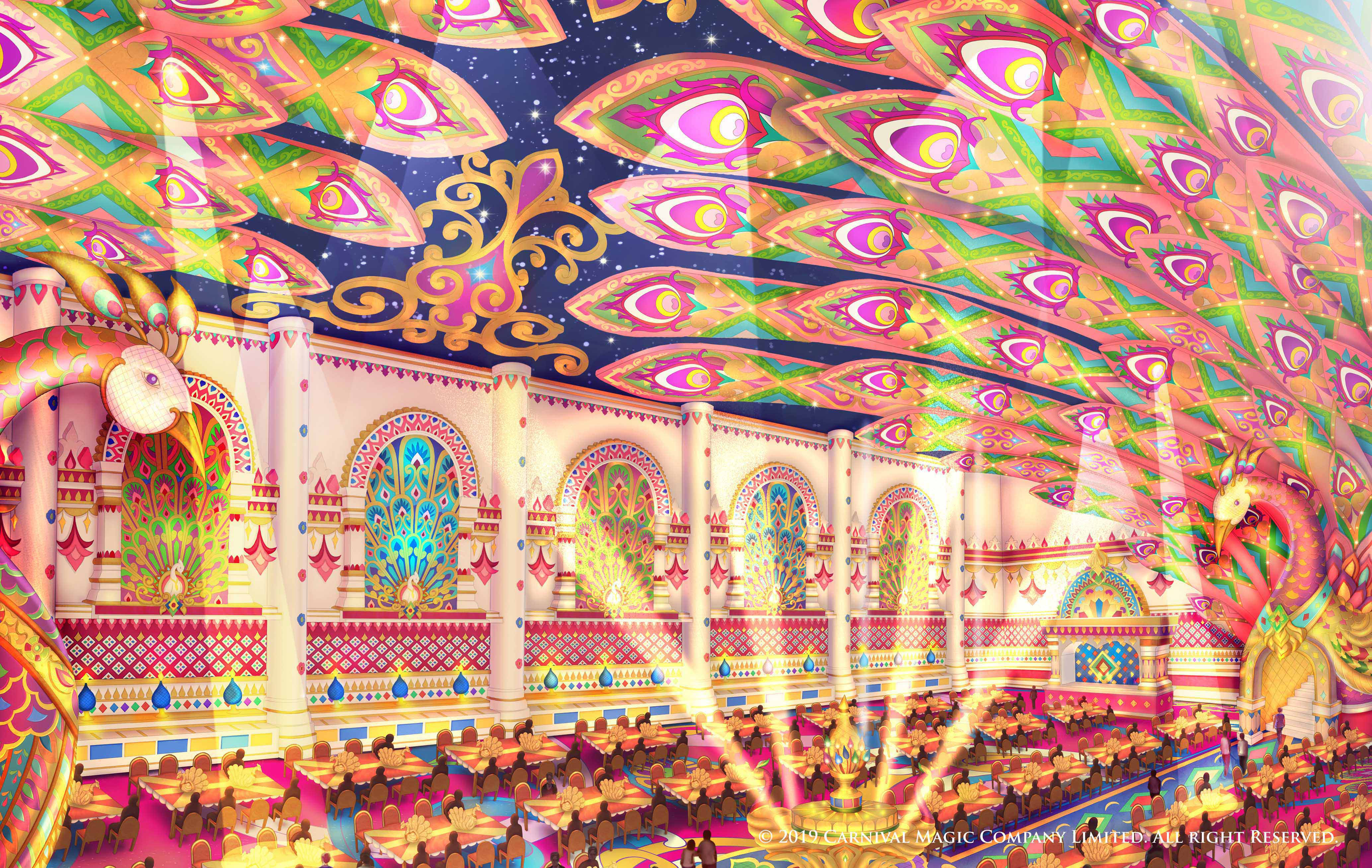 คาร์นิวัลเมจิกภายในให้บริการอาหารแบบเซ็ตเมนูที่ลูกค้าเลือกเองได้ ในบรรยากาศหรูหรา โคมไฟ ทำเป็นรูปกระทง เทศการรื่นเริงที่คนทั่วโลกรู้จักกันดี พื้นทางเดินทำเป็นรูปคลื่นน้ำ เพดานท้องฟ้ายามค่ำคืนมีแสงดาวระยิบระยับ