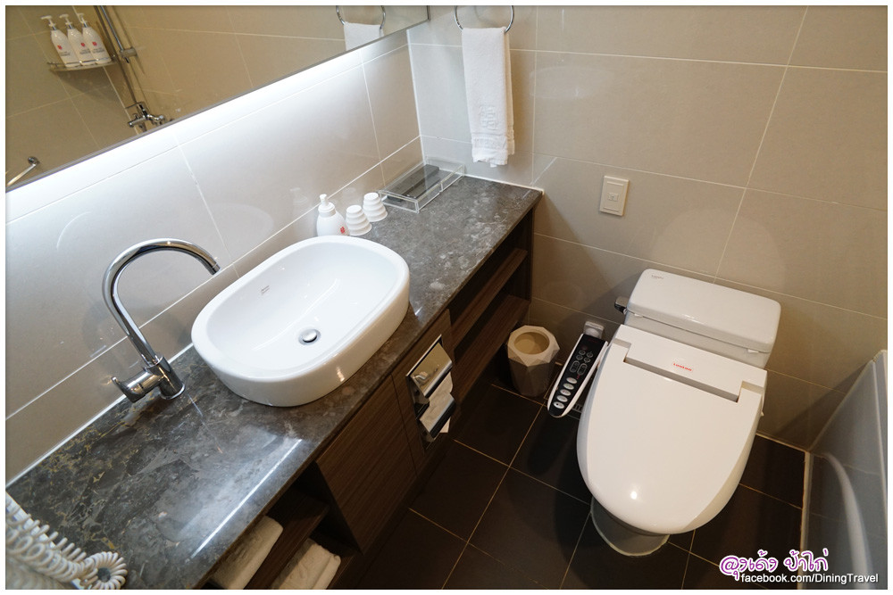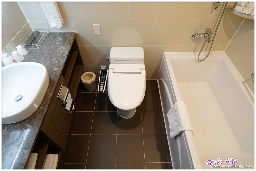 ห้องน้ำ มีอ่างอาบน้ำ อ่างล้างหน้า ชักโครก รวมอยู่ในห้องเดียวกัน