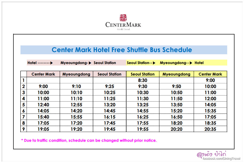 รวมถึง บริการฟรี Shuttle Bus รับส่งจากโรงแรม Center Mark -> เมียงดง (Myeoungdong) -> Seoul Station