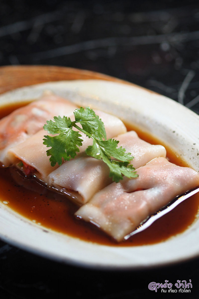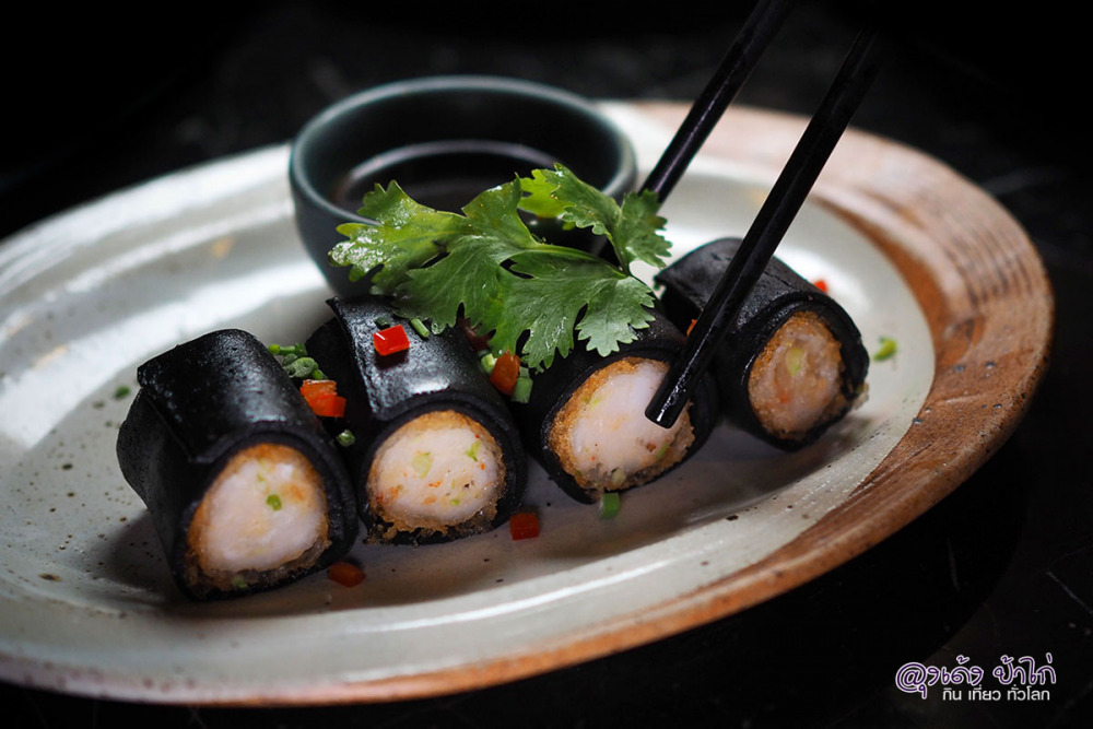 จานนี้ใส้กุ้งทอดกรอบห่อด้วยก๋วยเตี๋ยวหลอดหมึกดำ มีซีอิ้วปรุงรสมาให้ด้วย ก่อนกิน จะราดลงในจาน หรือ จะคีบเป็นคำๆ แล้วจุ่มลงในซีอิ้วก็ได้ตามชอบเลยครับ