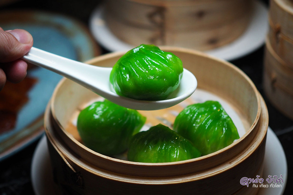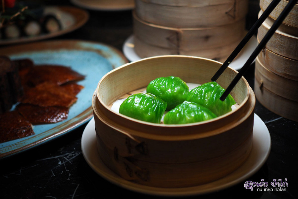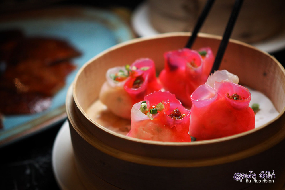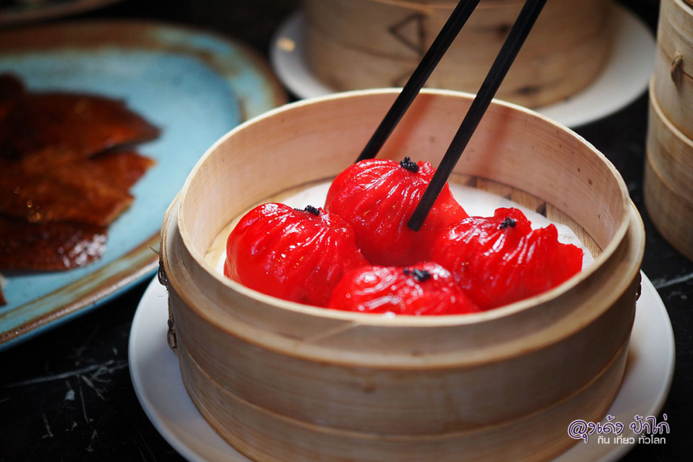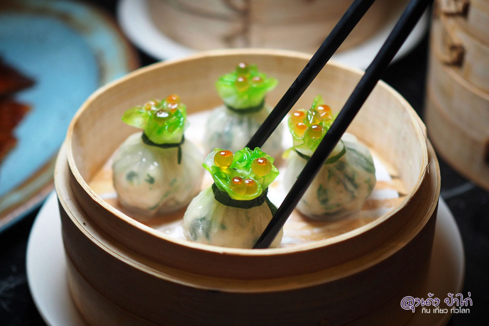 ศิลปะชิ้นงาม วางบนแข่ง นึ่งไปแรงๆ แต่ก็ยังออกมาสวยงาม ตัวนี้แป้งบางใส มองเป็นไส้ด้านในแบบสวยๆ เลย ด้านบนวางไข่ปลาแซลมอน อร่อยมากครับ