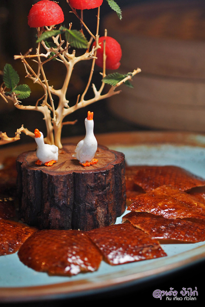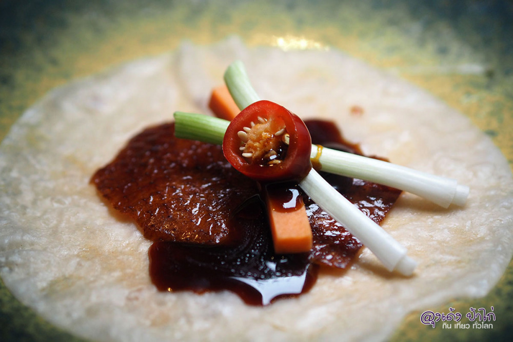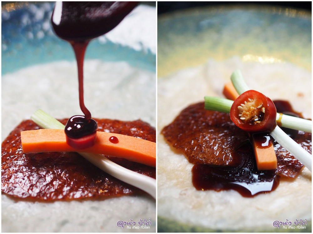 เป็ดปักกิ่ง หนังกรอบ ไร้มัน ชิ้นสวย เสิร์ฟพร้อม แผ่นแป้ง ผักเครื่องเคียง และ ซอสเป็ดย่าง