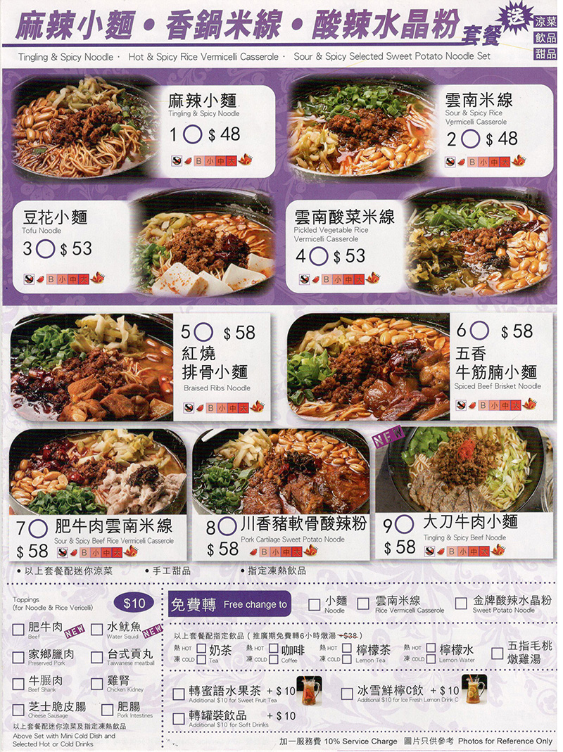 Tingling & Spicy Noodle เลือกระดับความเผ็ดได้ถึง 4 ระดับ ( ความเผ็ดนี้ มีส่วนผสมของ หม่าล่า ด้วยครับ) ราคาชามละ 48 - 58 เหรียญ และเลือกชนิดของบะหมี่ ได้ 3 แบบ คือ Noodle / Rice Vermicelli Casserole (คล้ายๆ เส้นขนมจีน) / Sweet Potato Noodle (คล้ายๆ วุ้นเส้นเกาหลี จะเหนียวๆ ใสๆ)