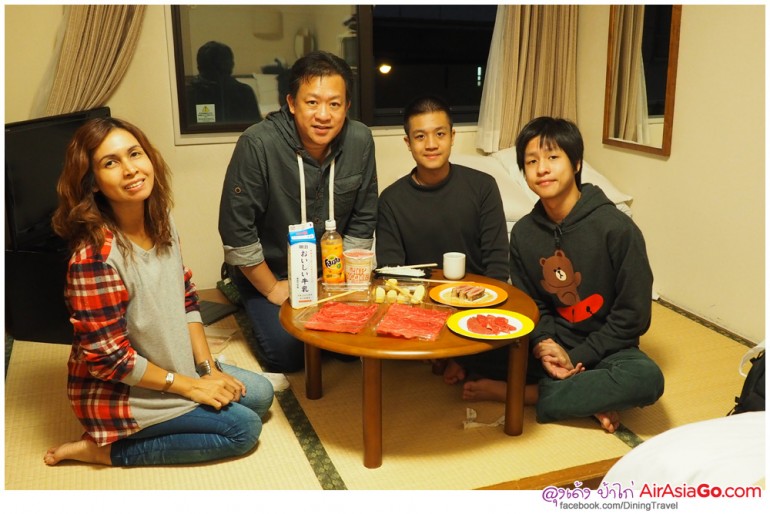 ห้องที่จองมา 4 คน (ผู้ใหญ่ 3 เด็ก 1) จะมีเตียงสำหรับ 2 คน (คนตัวเล็ก นอน 2 คนกำลังดี) และฟูกบางๆ สำหรับปูนอนที่พื้นห้องสำหรับ 2 คน พร้อมหมอนและผ้าห่ม - ฟูกที่ปูนอนบนพื้นห้อง แม่บ้านจะเข้ามาพักเก็บให้ทุกวัน เพราะบริเวณนี้คือที่นั่งสำหรับดู TV จะมีโต๊ะกลางไว้วางอาหารเครื่องดื่ม