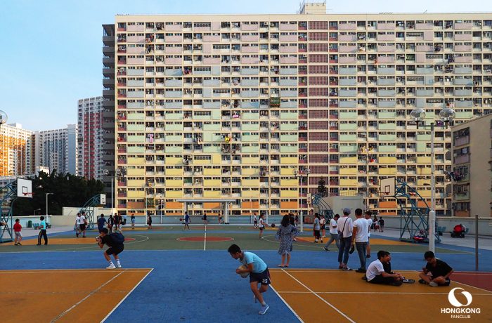 Choi Hung Estate หรือ ตึกสายรุ้ง จุดถ่ายรูปมุมนี้อยู่ในลานจอดรถ ด้านบนเป็นสนามบาส