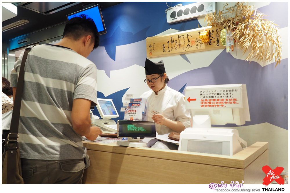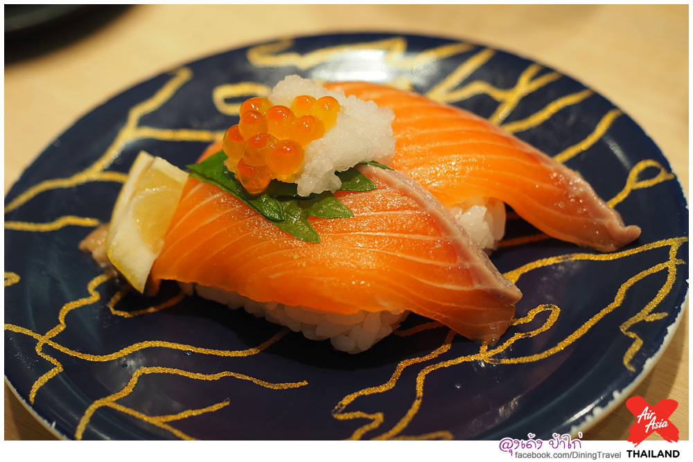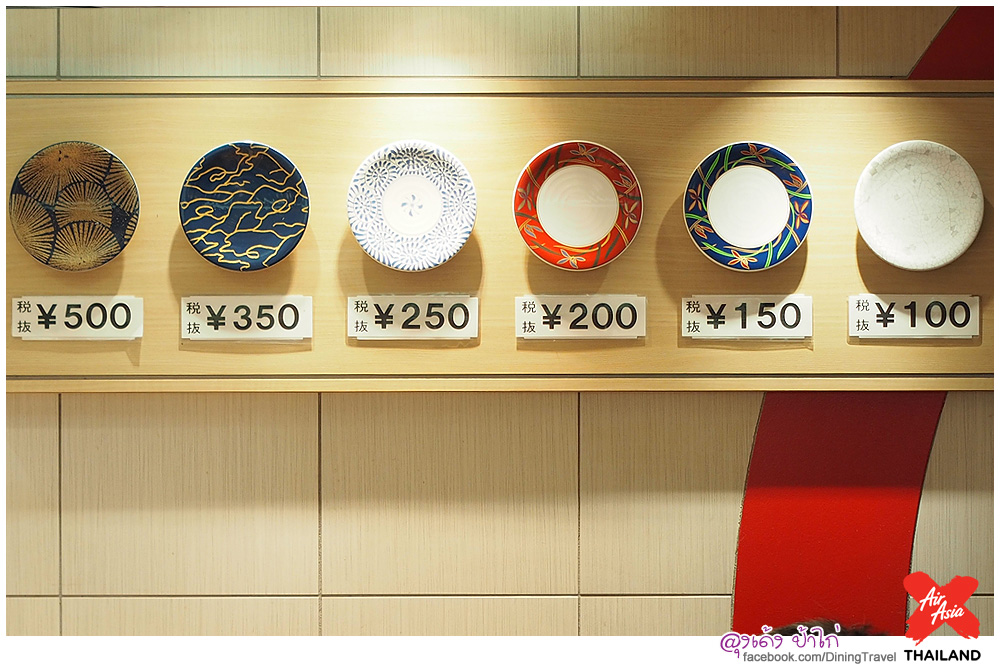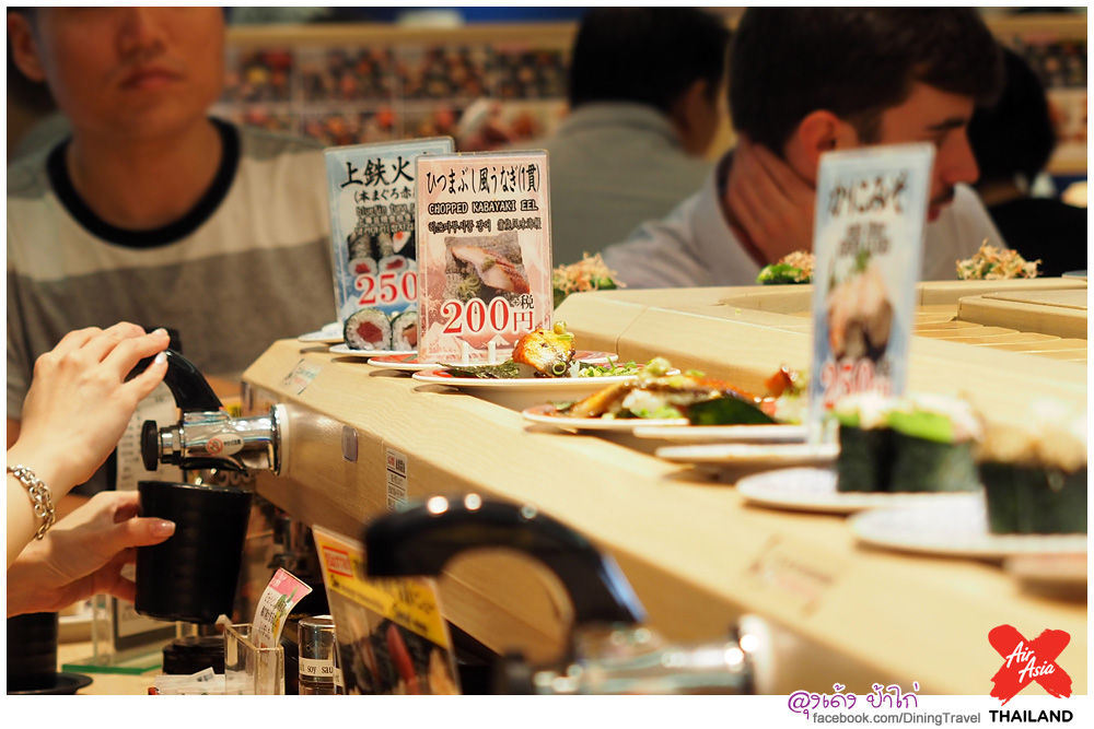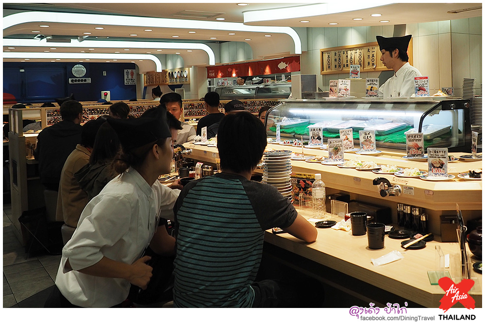 บรรยากศภายในร้าน เป็นที่นั่งแบบเคาน์เตอร์ ด้านหน้ามีสายพานซูชิจานเวียน เต็มไปด้วยซูชิหน้าต่างๆ เวียนมาให้ลูกค้าได้หยิบ โดยแต่ละชุดจานแรกจะเป็นป้ายราคาพร้อมรูปภาพ แล้วตามด้วยซูชิหน้าเดียวกัน 5 จาน จากนั้นก็มีหน้าต่างๆ ลำเลียงออกมาเป็นชุดๆ ทำให้เราทราบราคาก่อนที่จะหยิบ