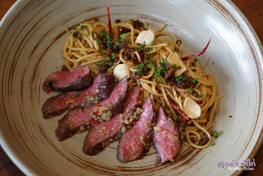สายพาสต้า... จานนี้ต้องไม่พลาดเช่นกัน เส้นสปาเก็ตตี้ผัดกับกระเทียม พริกแห้ง โรยด้วยเบคอนกรุบกรอบ พระเอกของจานนี้ก็คือ เนื้อวากิวชิ้นพอดีคำ ราดซอสกระเทียม หอมฟุ้งไปทั้งจาน