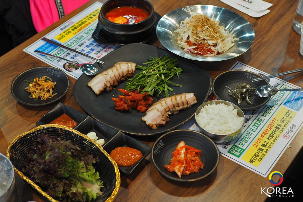 ภาพขวา : โพซัม (보쌈 หมูสามชั้นต้มซีอิ้ว) เสิร์ฟพร้อมกับ ซุปเต้าเจี้ยว + ข้าวสวย + เครื่องเคียง และผักสด ราคาชุดละ 8000 วอน
