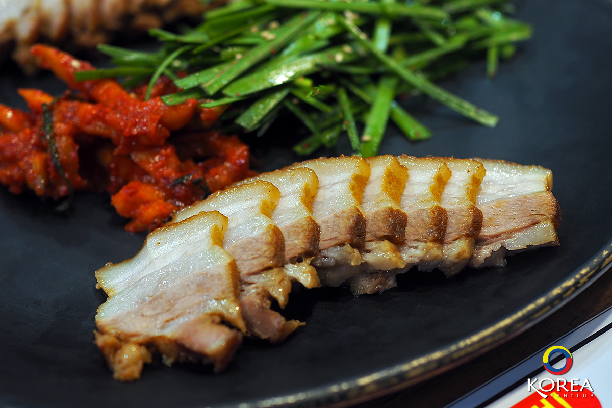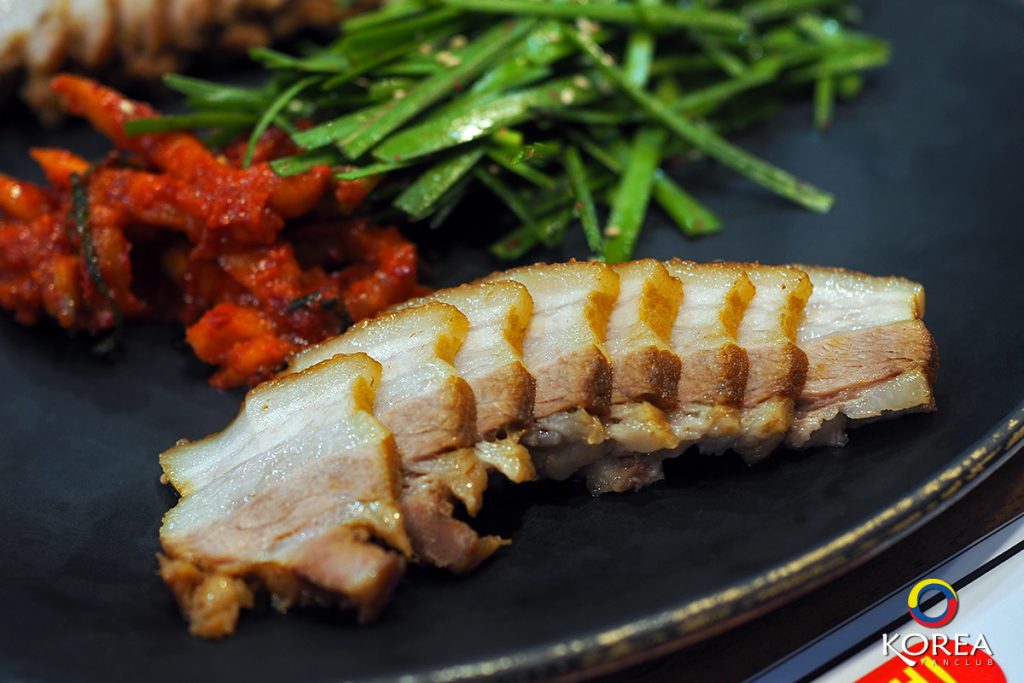 โพซัม (보쌈) หรือ หมูสามชั้นต้มซีอิ้ว หั่นชิ้นสวย เนื้อหมูนุ่มมาก เมนูธรรมดาๆ แต่อร่อยมาก เวลากินรวมกับผักสด และ น้ำพริกซัมจัง