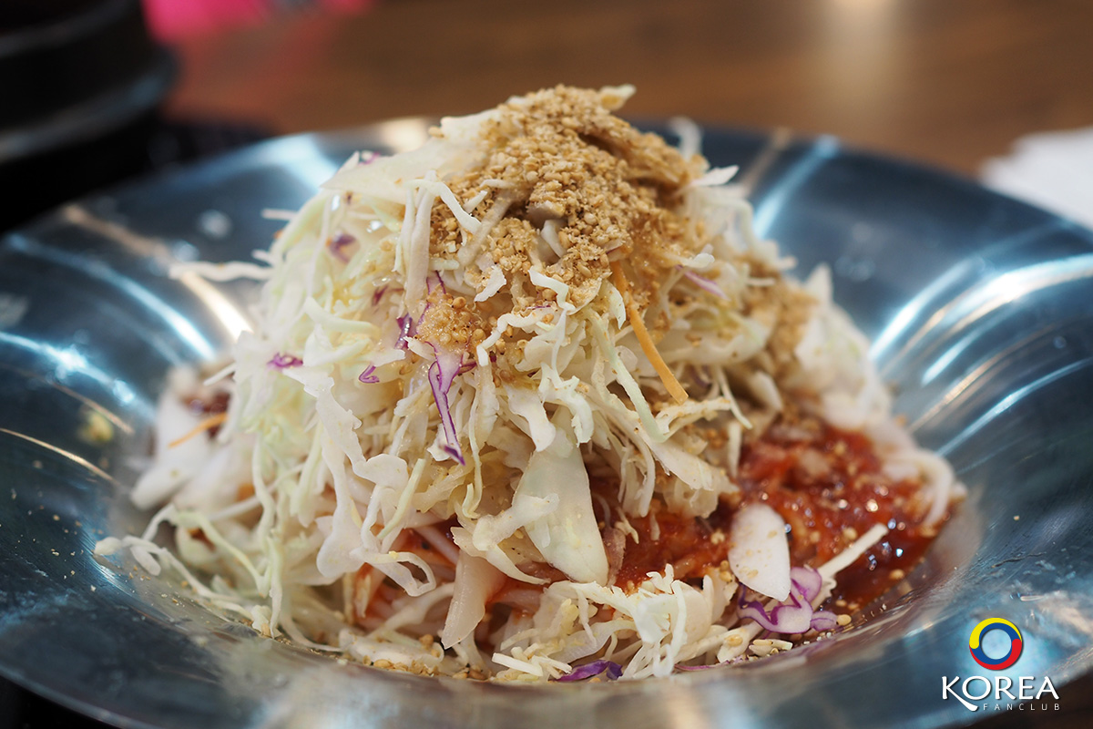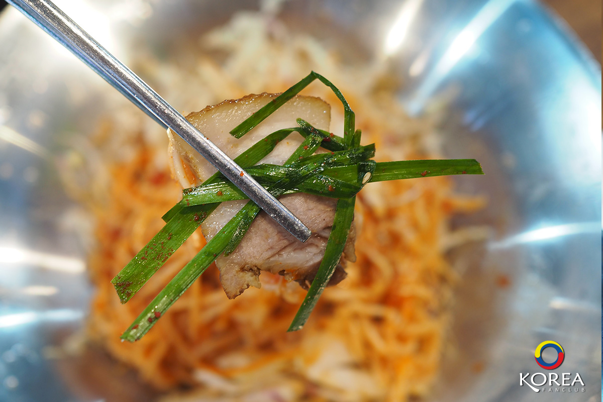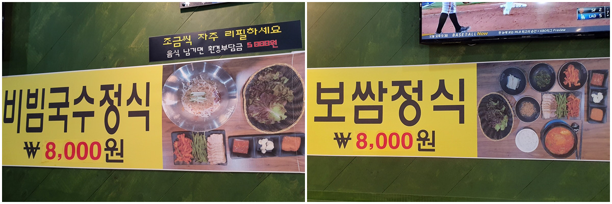 ภาพซ้าย : โพซัม (보쌈 หมูสามชั้นต้มซีอิ้ว) เสิร์ฟพร้อมกับ ยำบะหมี่เย็น + ผักสด ราคาชุดละ 8000 วอน