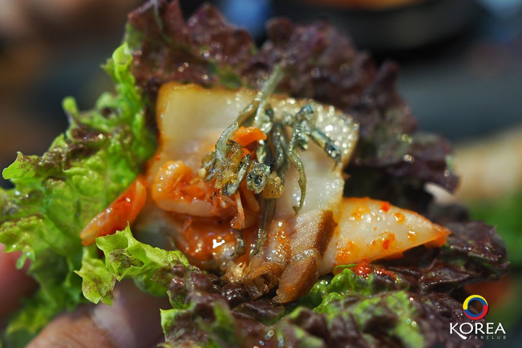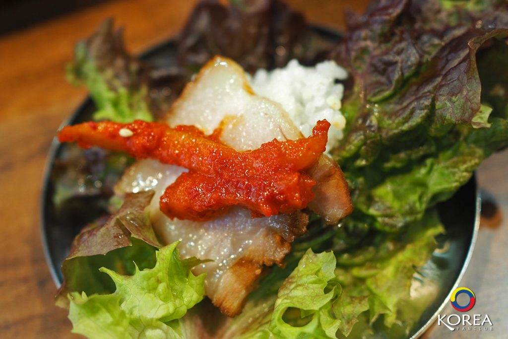 ไม่นาน อาหารก็มาเสิร์ฟเต็มโต๊ะ โพซัม (보쌈) คือ หมูสามชั้นต้มซีอิ้ว ในจานกลางมีหมูสามชั้น 2 ฝั่ง (ฝั่งละ 1 คน) ชุดนี้ ก็ 8,000+8,000 = 16,000 วอน (ประมาณ 480 บาท)