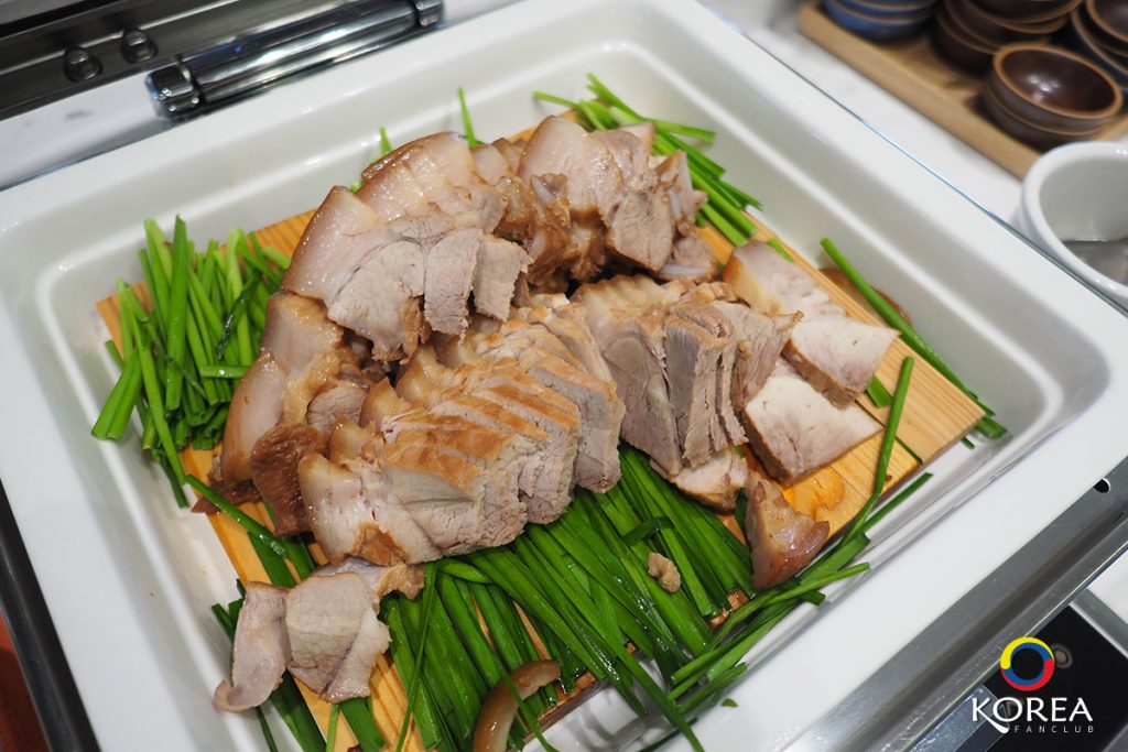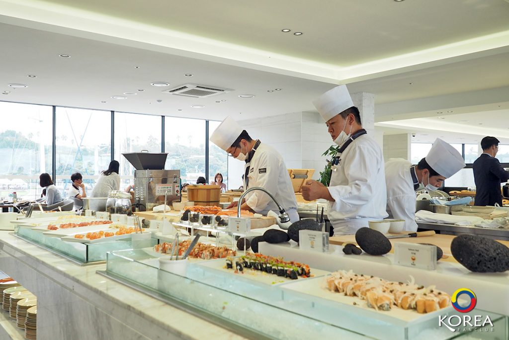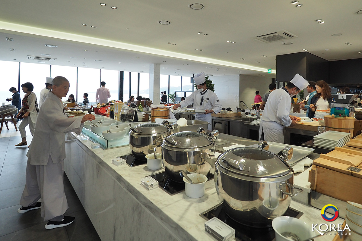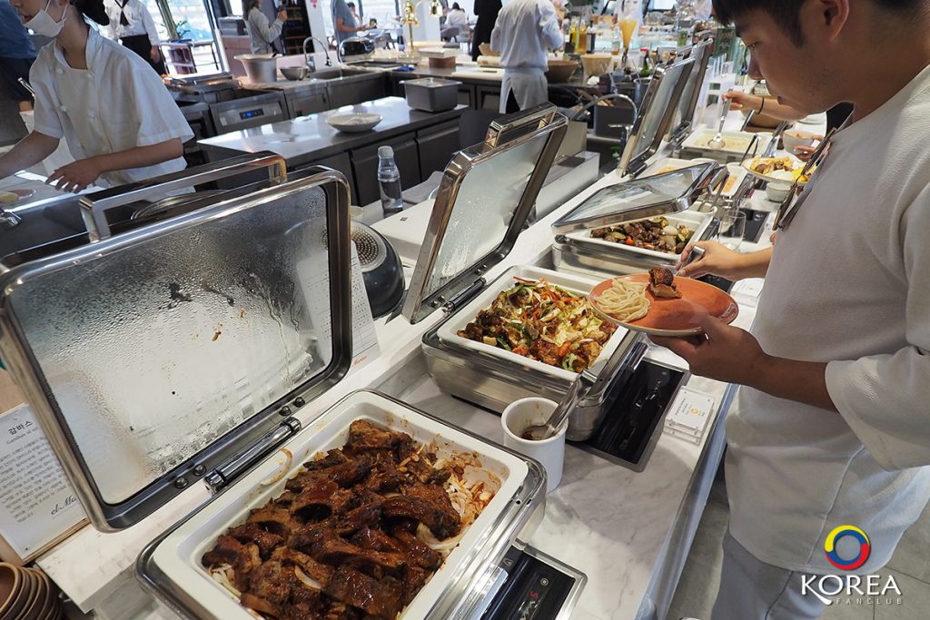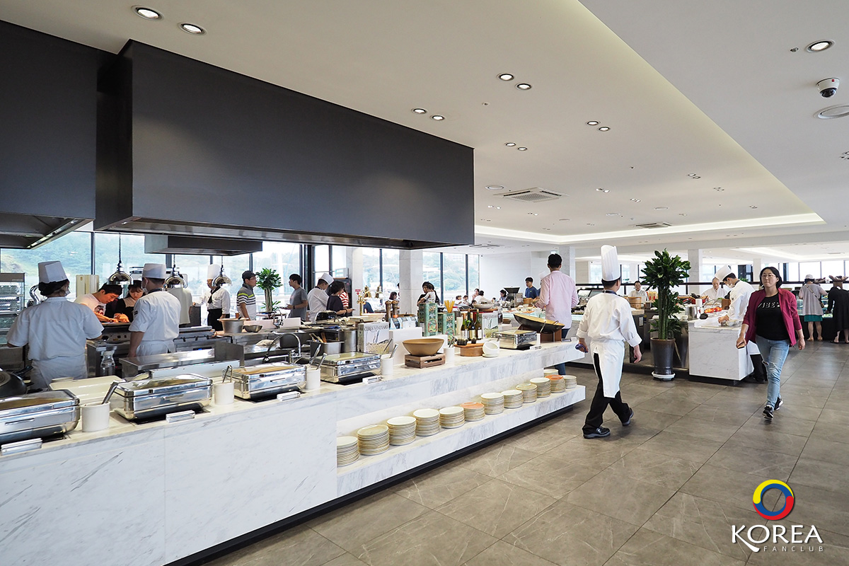 รูปแบบของบุฟเฟ่ต์เป็นอาหารนานาชาติ มีให้เลือกประมาณ 100 รายการ โดดเด่นทีสุดคืออาหารท้องถิ่งแบบเกาหลี