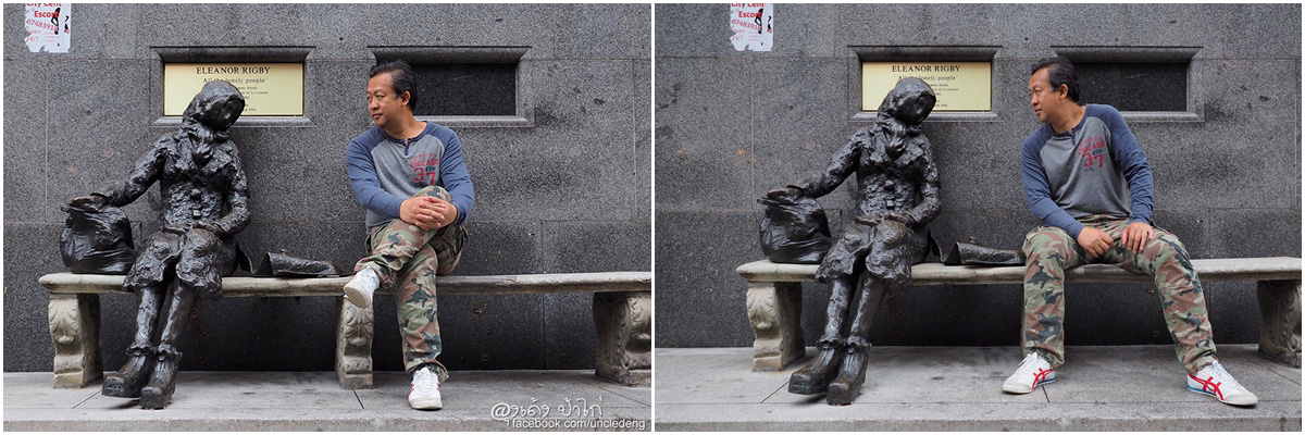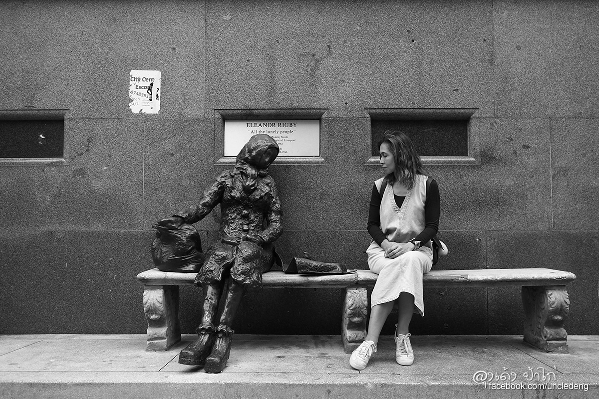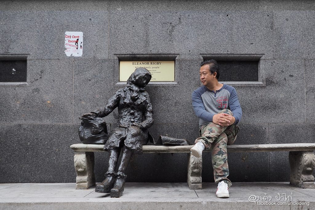 ก่อนเดินทางออกจาก ลิเวอร์พูล ลุงเด้งป้าไก่ มาถ่ายรูปเป็นที่ระลึกกับ Eleanor Rigby "All the lonely people" รูปหล่อโลหะ ที่ Stanley Street, เมือง Liverpool