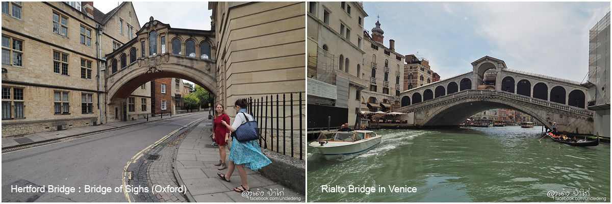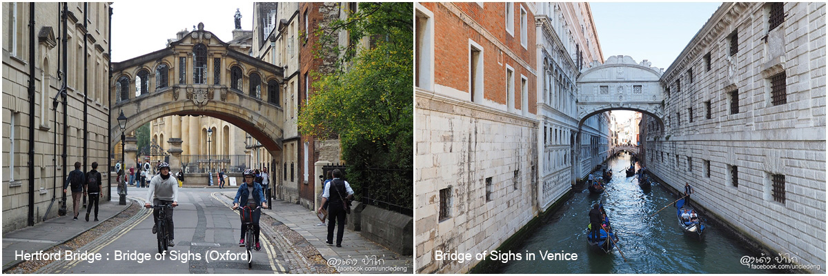 ที่คนทั่วไปเรียก Hertford Bridge ว่า Bridge of Sighs เพราะเป็นสะพานเชือมตึก 2 ตึก เพื่อให้นักศึกษาเดินข้ามไปเรียนหนังสือ แต่ Bridge of Sigh ที่ Venice มีไว้ให้นักโทษเดินเข้าคุกตลอดชีวิต มีหน้าต่างบานเล็กๆ ให้มองเห็นวิวเป็นครั้งสุดท้าย