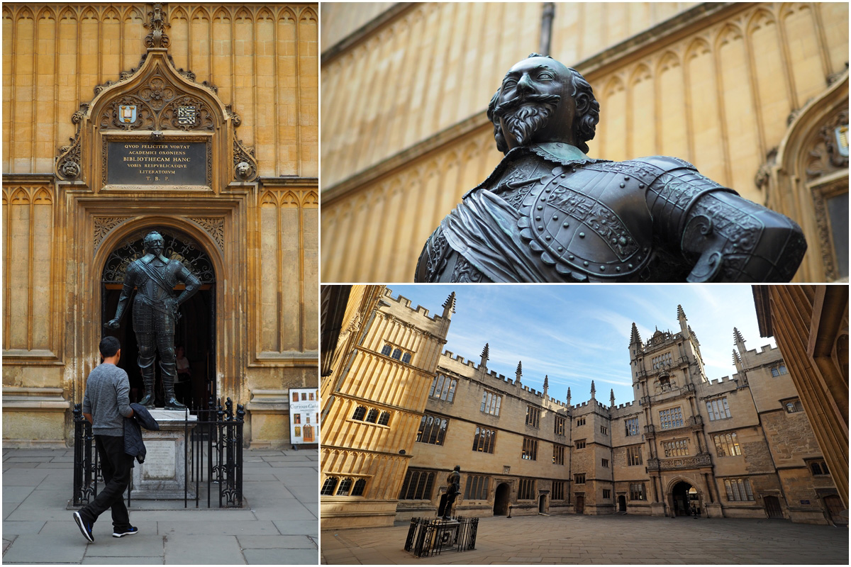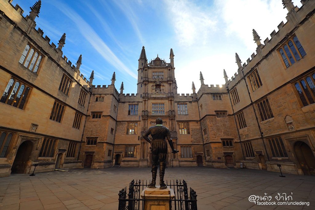 ในภาพนี้คือ รูปหล่อของ Sir Thomas Bodley ยืนหันหน้าไปทาง Tower of the Five Orders ซึ่งเป็นส่วนหนึ่งของ Bodleian Library