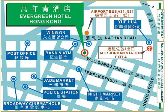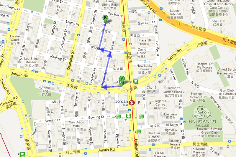 การเดินทางโดย MTR ลงที่ สถานี Jordan ทางออก A (จุด A) เดินตามเส้นทางไปที่ EVERGREEN HOTEL (จุด B)