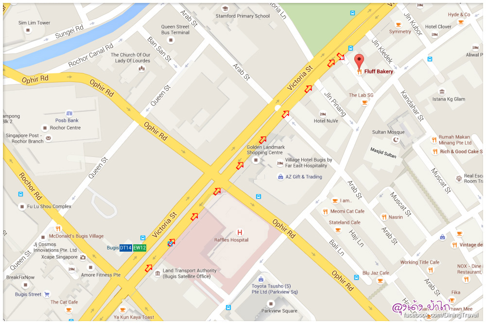 การเดินทาง : สถานี Bugis ทางออก B เดินเลียบถนน Victoria ตามลูกศร ไม่เกิน 5 นาที ร้าน Fluff Bakery ตั้งอยู่ในถนน Jln Pisang