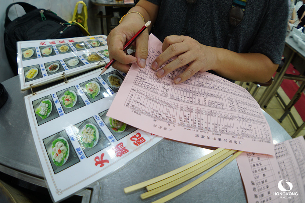 ใบสั่งอาหารจะเป็นกระดาษสีชมพู (บางครั้งสีขาว) จะเป็นภาษาจีน แต่มีหมายเลขกำกับเช่นกัน