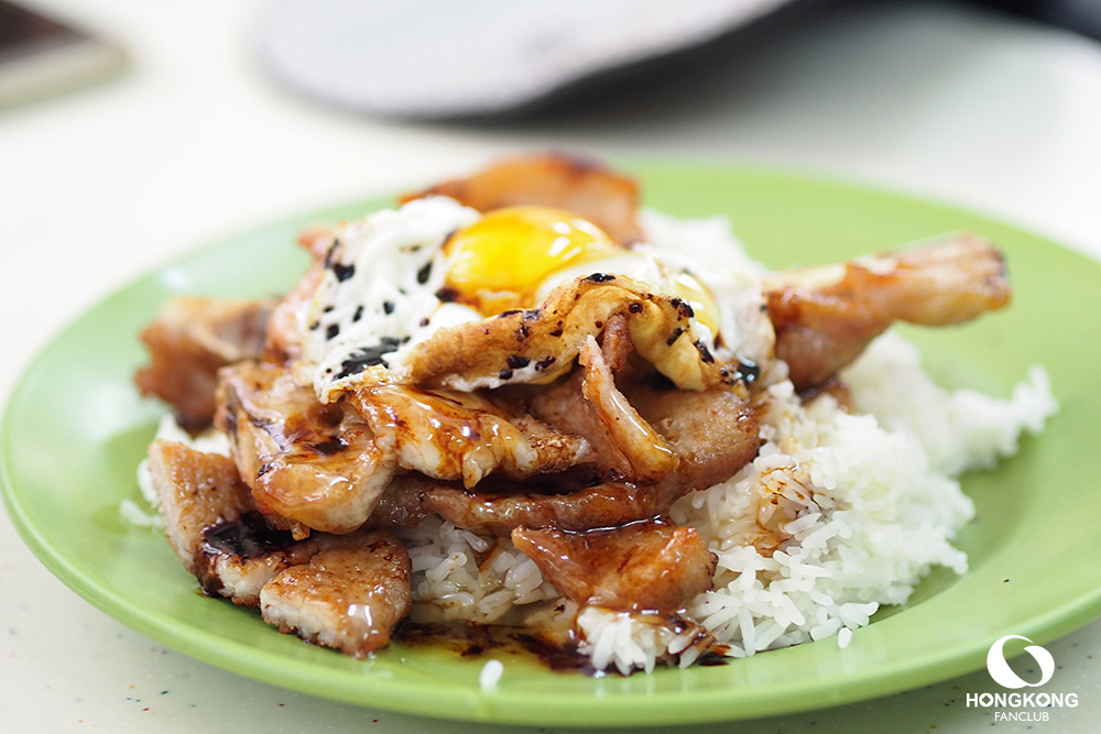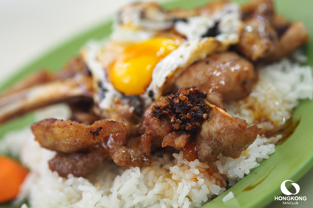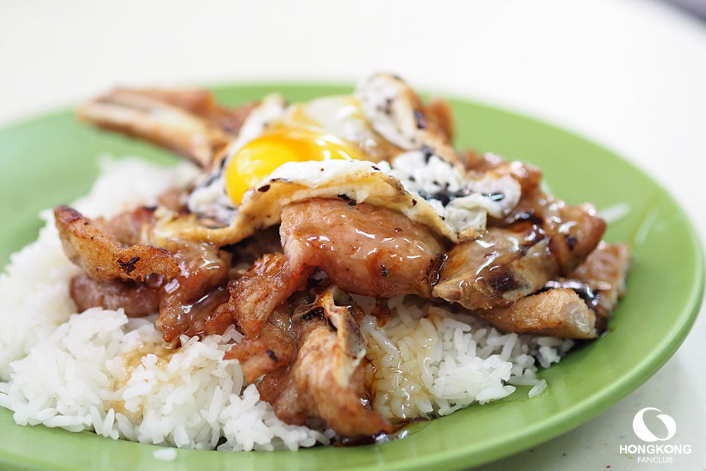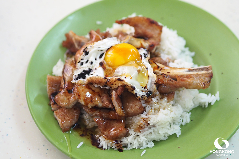 ข้าวหมูทอดจานนี้ HK$ 49 เหรียญ + ไข่ดาว HK$ 3 เหรียญ