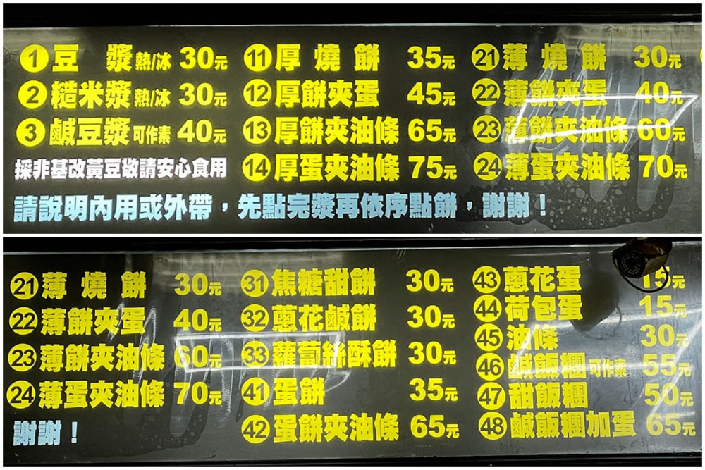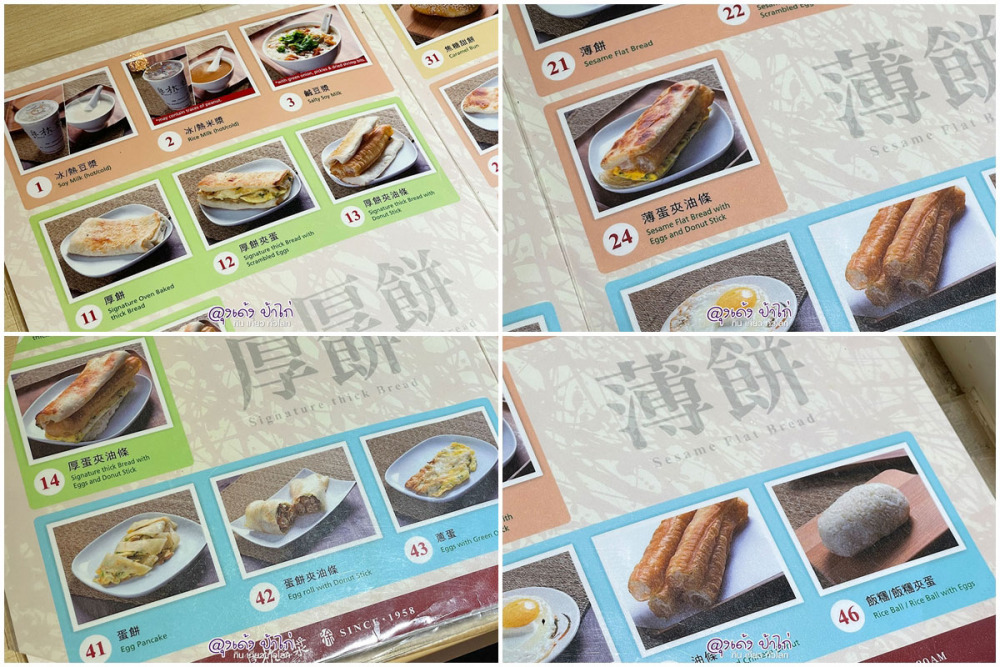 ฝู้หั๋น โต้เจียง 阜杭豆漿ในเมนูอาหาร จะไม่มีราคากำกับ มีแต่ รูปภาพ กับ หมายเลขอาหาร : ถ้าเราอยากรู้ราคาก็ต้อง เอารายการอาหารที่มี ตัวเลข มาเทียบกับ ราคาในป้ายนี้
