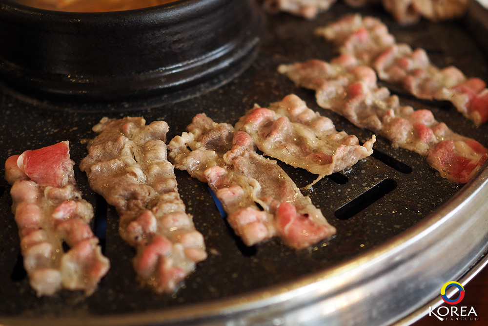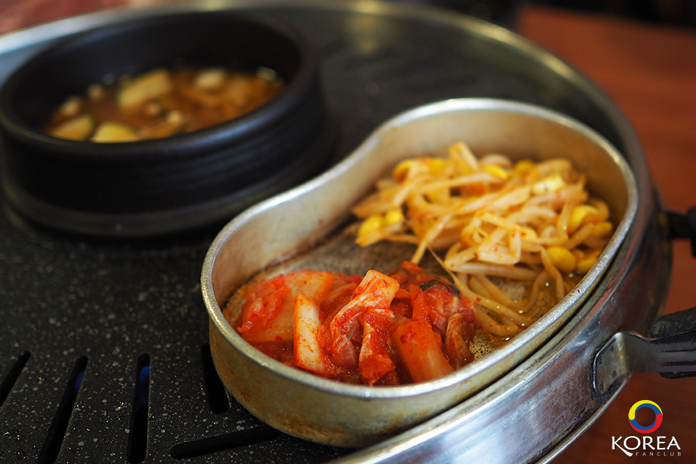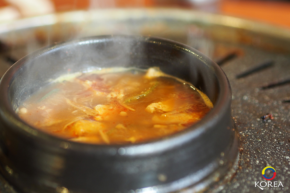 เตาย่างก็จะมี ที่ย่างกิมจิ เป็นถาดมาให้ ตรงกลางจะเป็นซุปเต้าหู้กิมจิ รสชาติอร่อยใช้ได้เลย (ซุปกิมจิ แนะนำให้ใส่เนื้อหมูย่างลงไปต้มด้วย ต้มนานๆ ให้เปื่อยเลย กินอร่อยมาก)