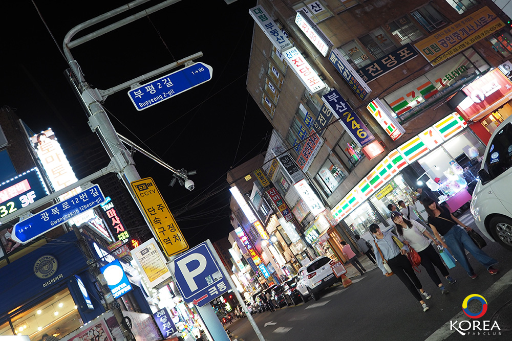Gwangbokdong Food Street ถนนอาหารแห่งปูซาน อยู่ด้านหลัง ถัดจาก ถนน Bupyeong 2-gil เส้นนี้แหละครับ ร้าน BORNGA HANOKJIB Kimchi-Jjim มีเมนูเด่นคือ Steamed Kimchi and Pork จะอยู่ถัดจากร้าน 7 eleven นี้แหละครับ
