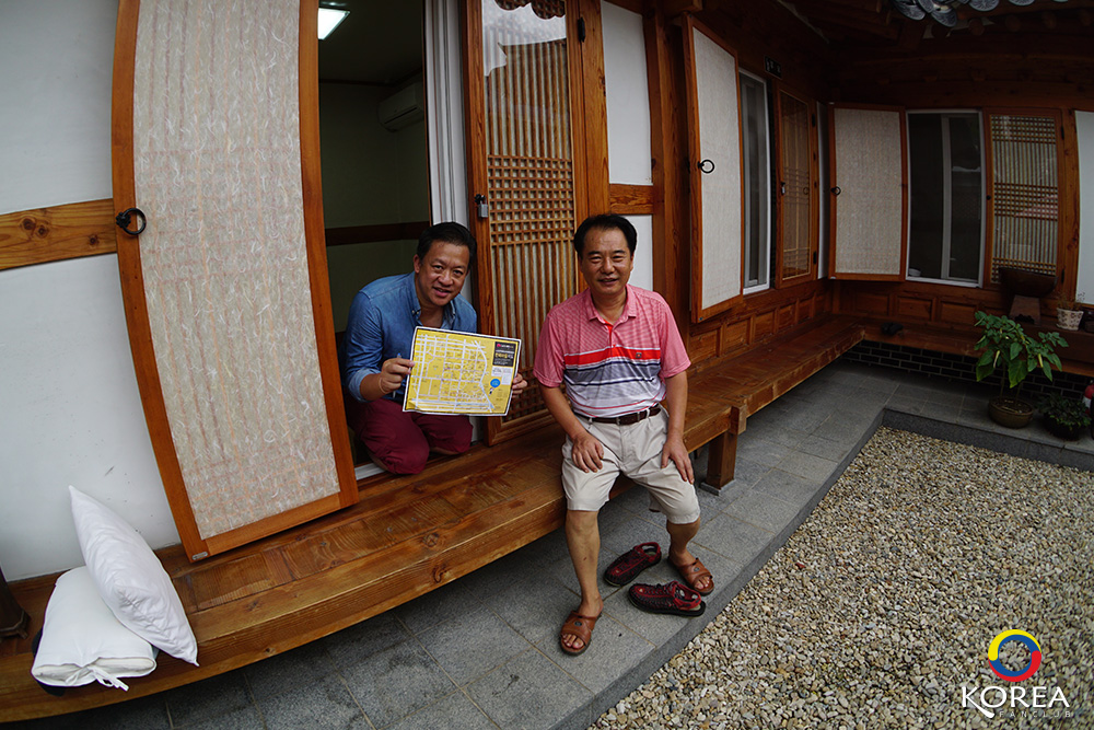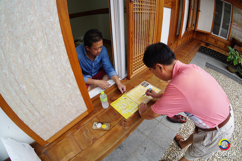 คุณลุง คุณป้า เจ้าของบ้านก็จะมาต้อนรับ แล้วพาไปที่ห้องพัก แล้วนำแผนที่หมู่บ้านโบราณ (Jeonju Hanok Village)ให้เรา 1 ชุด