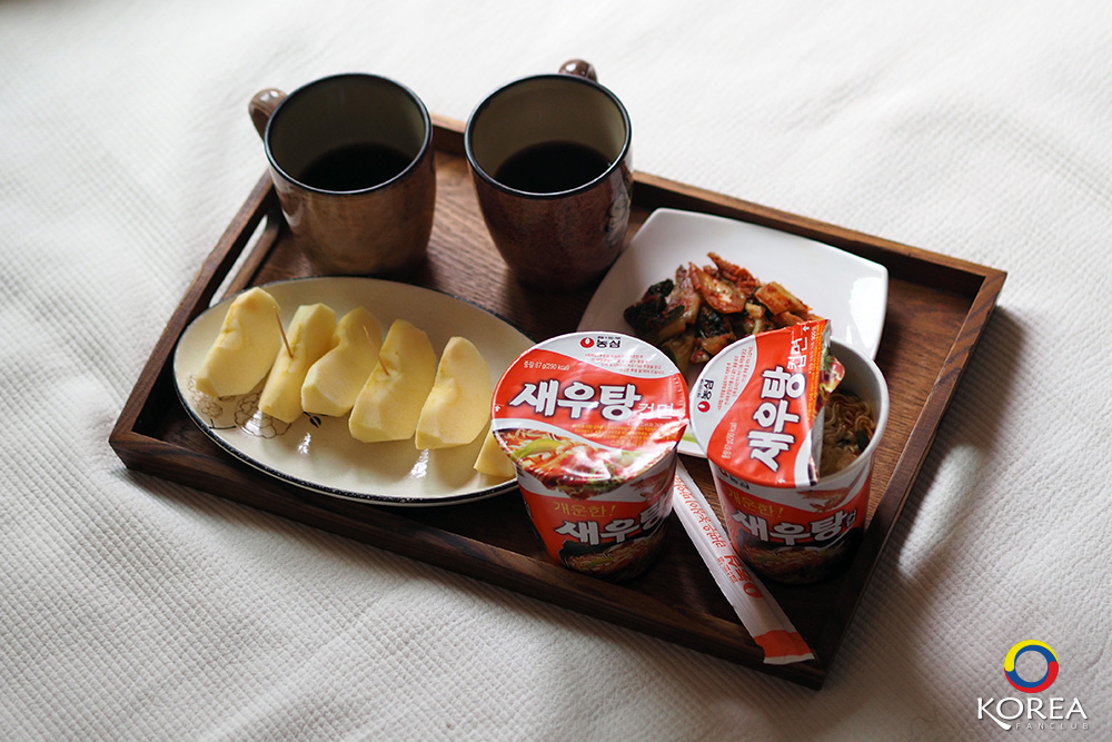 ทุกวัน เวลา 9 โมงเช้า คุณลุง คุณป้า จะนำ อาหารเช้าใส่ถาดมาให้ บะหมี่สำเร็จรูป 2 ถ้วย ผลไม้ 1 จาน และ กาแฟ 2 แก้ว