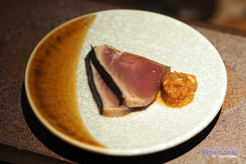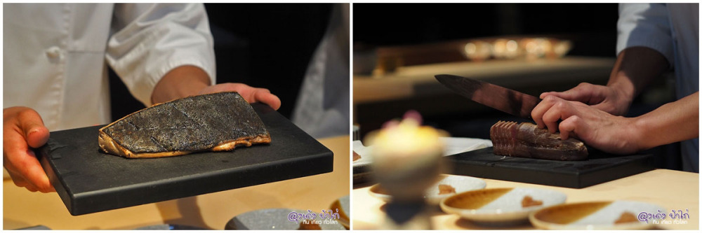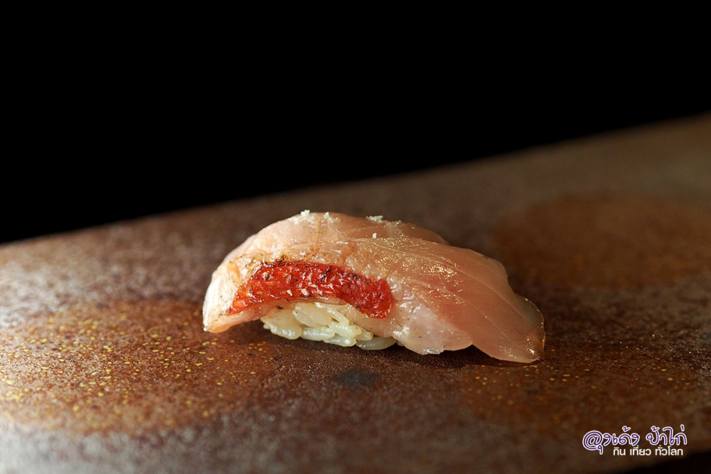 ปลากระพงแดงตาโต ปลาเนื้อนุ่ม หอม มัน ก่อนเสิร์ฟ ทำการจี่ด้วยถ่านร้อนๆ (Aburi) ที่หนังปลา จะได้ความหอมกลิ่นถ่าน และดึงรสชาติของหนังปลาให้โดดเด่นมากยิ่งขึ้น