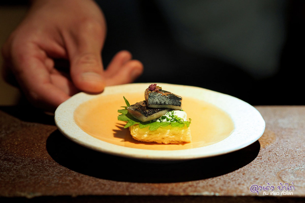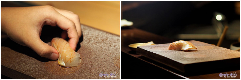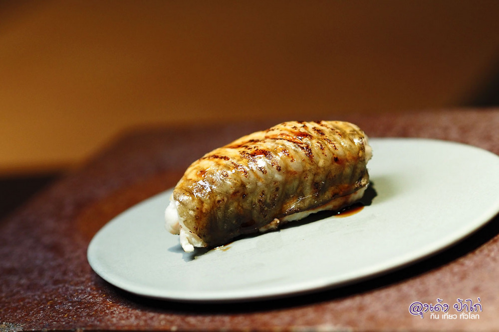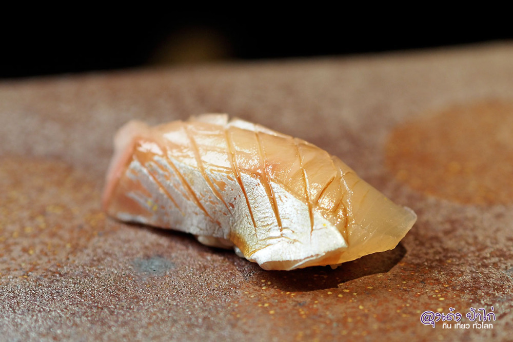 เนื้อปลาในตระกูลซาร์ดีนให้รสออกมัน เชฟได้นำไป Aging 1 สัปดาห์ ก่อนจะนำไป aburi หรือการนำถ่าน Binchotan มานาบ เพิ่มกลิ่นหอม และให้ไขมันแตกตัว