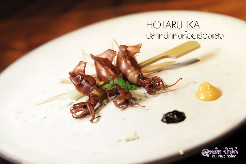 Hotaru-ika ปลาหมึกโฮตารุ เป็นปลาหมึกญี่ปุ่นสายพันธุ์เล็ก ( ความอร่อยตามฤดูกาล ) ใน 1 ปี จะมีเพียง 3 เดือน ช่วง มีนาคม เมษายน และ พฤษภาคม เท่านั้น ย่างพอสุก เสิร์ฟพร้อมกับ เครื่องปรุง 3 ชนิด