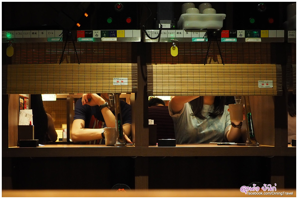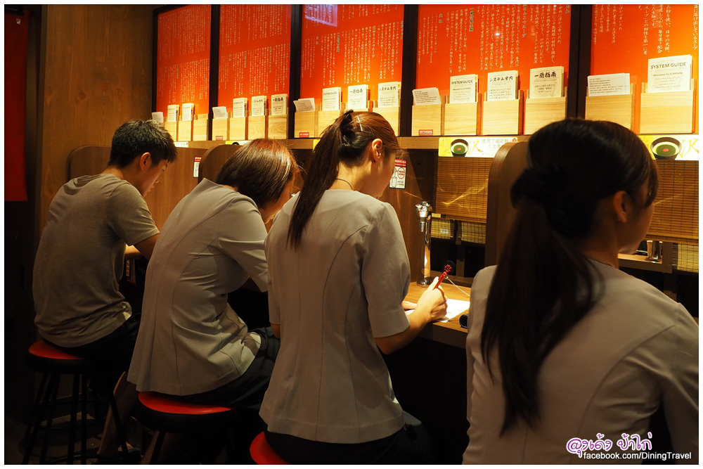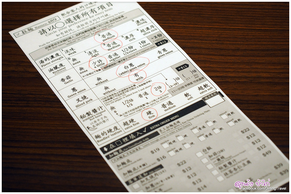 The design of these bars, as mentioned briefly above, are individual seats with walls on both the customer’s sides, a personal water station, and a screen in front of the customer. This screen is left open to enable the customer to hand over the ‘exam sheet’, or your order of noodles, to the ‘instructor’, also known as the waiter. Adding on to the exam style were an ordering paper with multiple choices of the ramen's toppings.