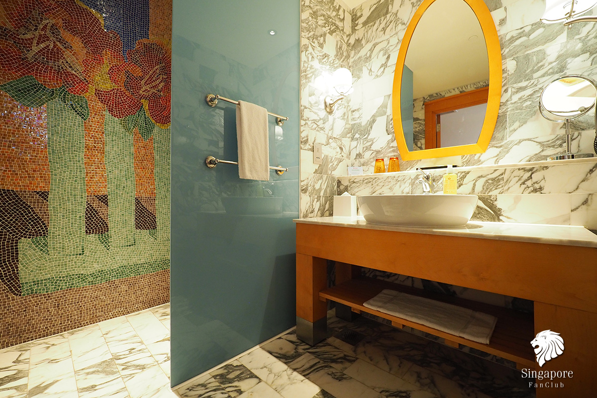ความโดดเด่นของห้องน้ำอยู่ที่ผนังโมเสก ลวดลายสีสดใส กระจกเงาในห้องน้ำก็ยังเป็นหนึ่งในสัญลักษณ์การออกแบบของ Michael Graves สถาปนิกชาวอเมริกันผู้โด่งดัง