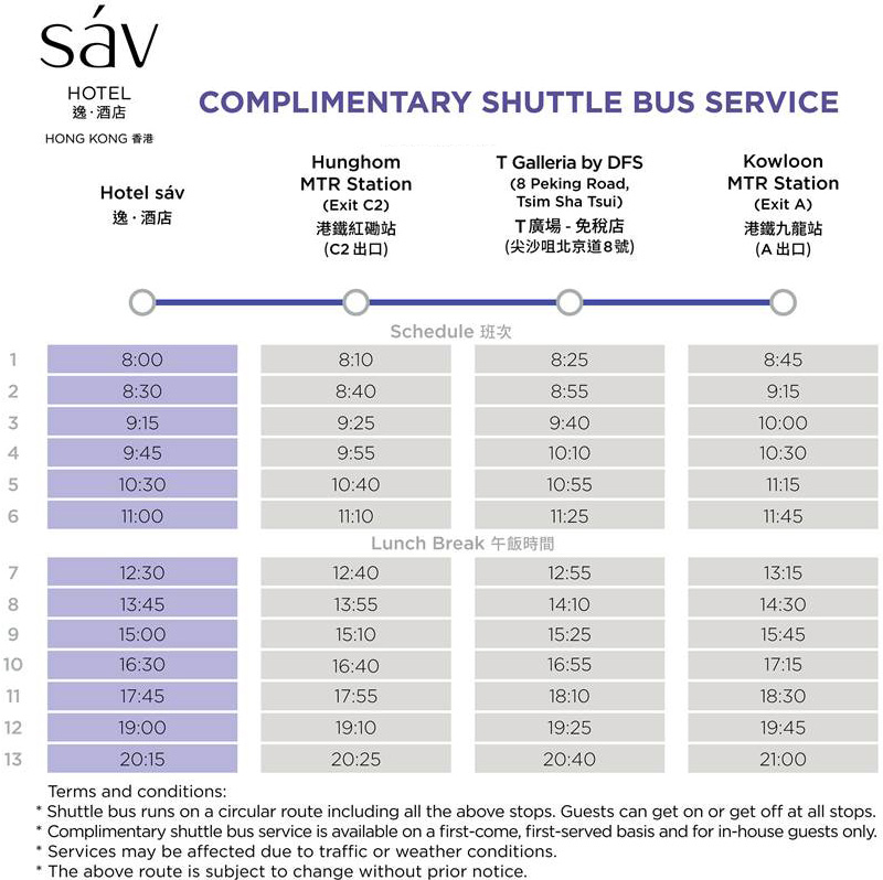 4. ฟรี : บริการ Shuttle Bus รับส่งจากโรงแรมไปยัง Hung Hom Station -> Tsim Sha Tsui Galleria -> Kowloon Station