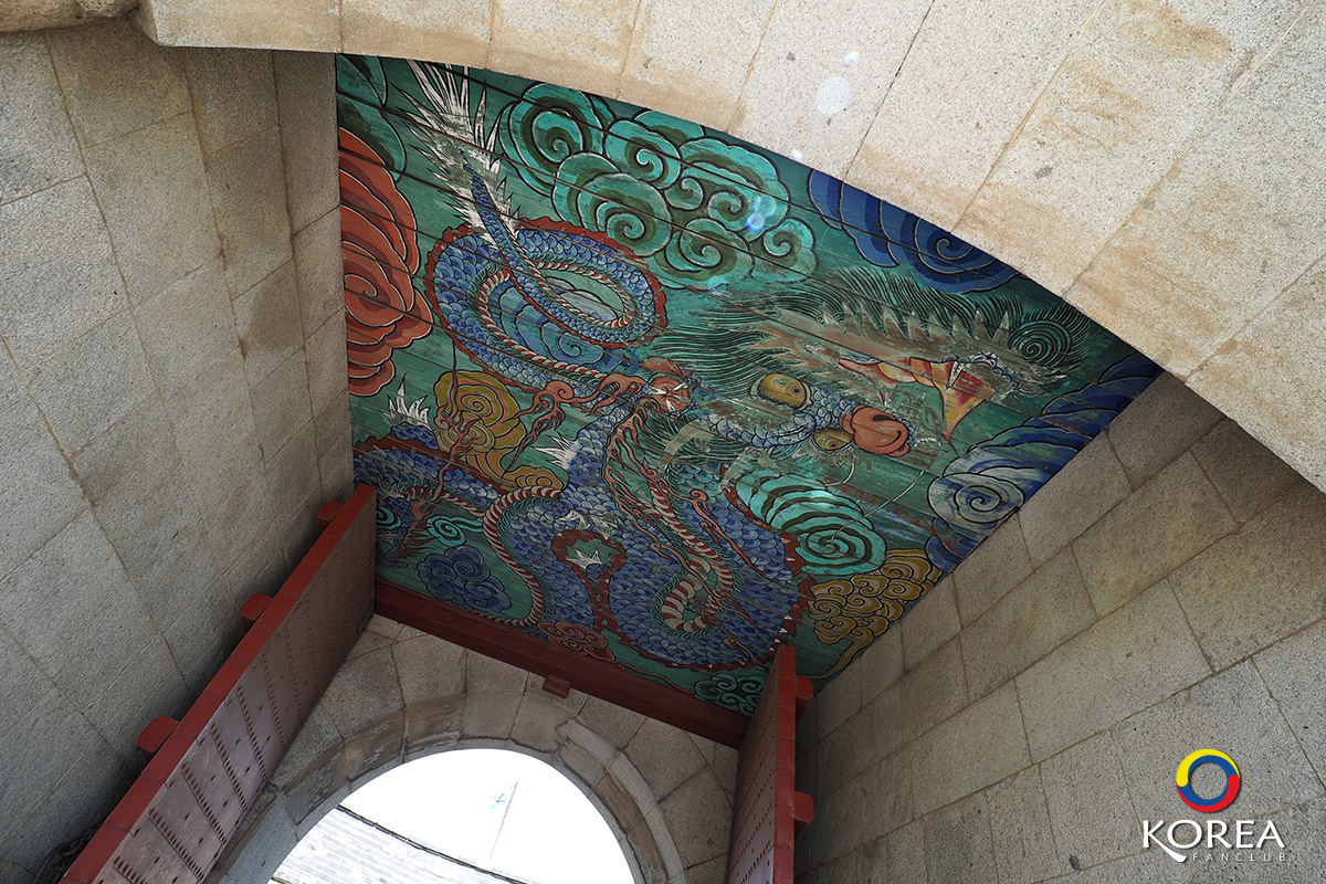 ภาพวาดมังกรแบบเกาหลี บนเพดานของประตูเมือง Changnyongmun Gate ได้รับอิทธิพลมาจากจีน มังกร คือสัญลักษณ์ของ กษัตริย์เกาหลี เช่นกัน