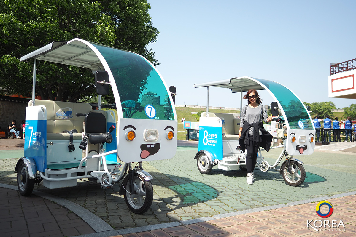 Velo Taxi แท๊กซี่จักรยานไฟฟ้าชมเมือง 1 คัน รับผู้โดยสารได้ 2 คน ค่าบริการคนละ ผู้ใหญ่ 5,000 วอน / วัยรุ่น 3,000 วอน / เด็กเล็ก 1,000 วอน จะมี 3 เส้นทางให้เลือกแนะนำให้ลองนั่งดูครับ ไม่ต้องเดินให้เมื่อย เพราะแต่ละจุดห่างกันพอสมควร
